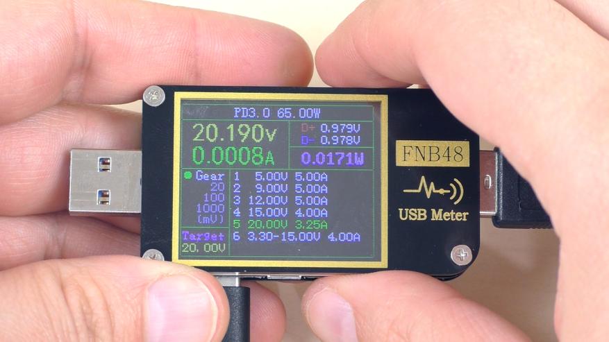 При увеличении нагрузки порт без труда выдал все заявленные 65 Вт мощности при напряжении 20 В и токе 3,25 А. Пульсации в этих условиях составляют около 160 мВ, что соответствует 0,8%.