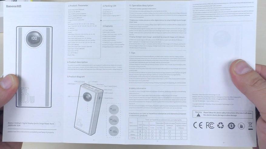 В комплекте с повербанком имеется метровый кабель USB‑C - USB‑C с заявленной поддержкой мощности 100 Вт. Также в набор входят гарантийный талон и инструкция на двух языках — китайском и английском.