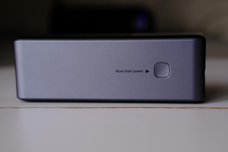 Если посмотреть на правый торец, то здесь можно увидеть кнопку. Она заботливо подписана «more than power». Так как не только включает повербанк, но и переключает экраны, меняет режимы