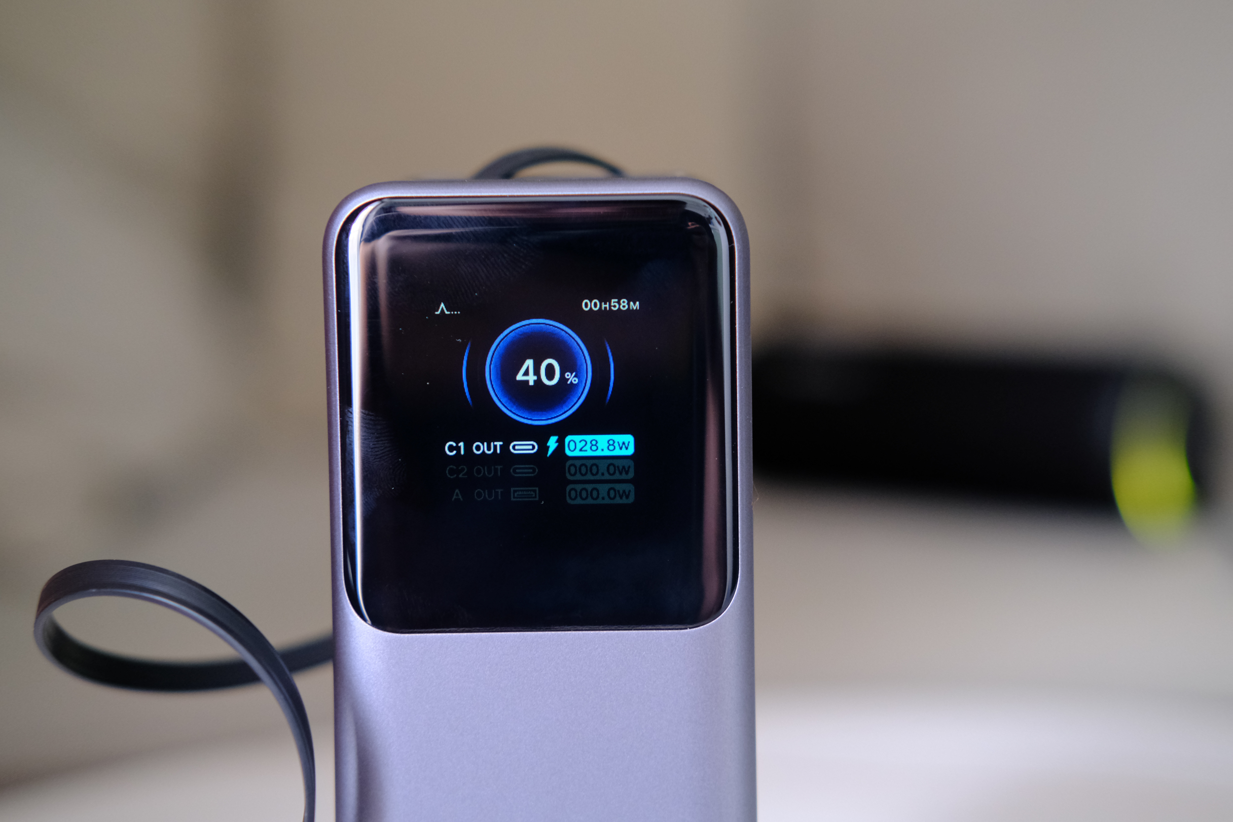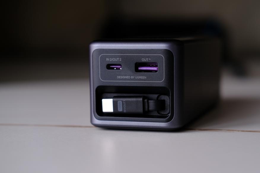 Ну и самое интересно. Верхний торец. Тут находятся все порты, а также выдвижной шнур Type-C. Встроенный сразу в повербанк и имеющий механизм скручивания