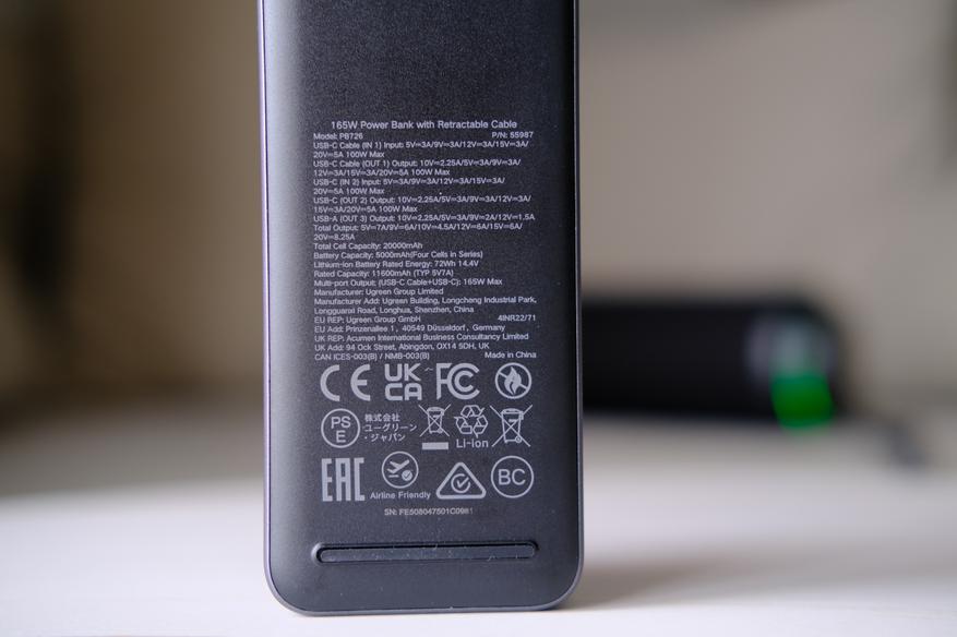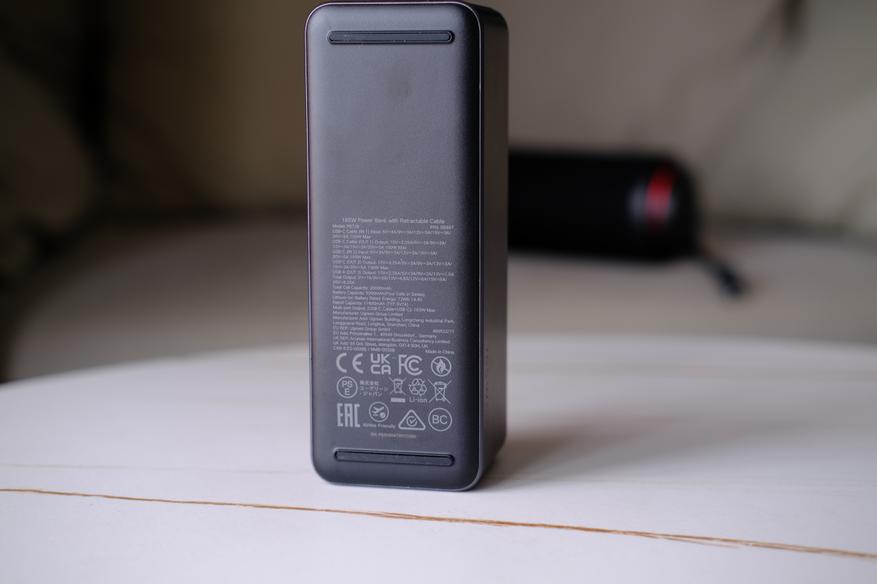 На задней стороне повербанка находятся две силиконовые ножки, с которыми он не скользит по столу. И также много различной сервисной информации