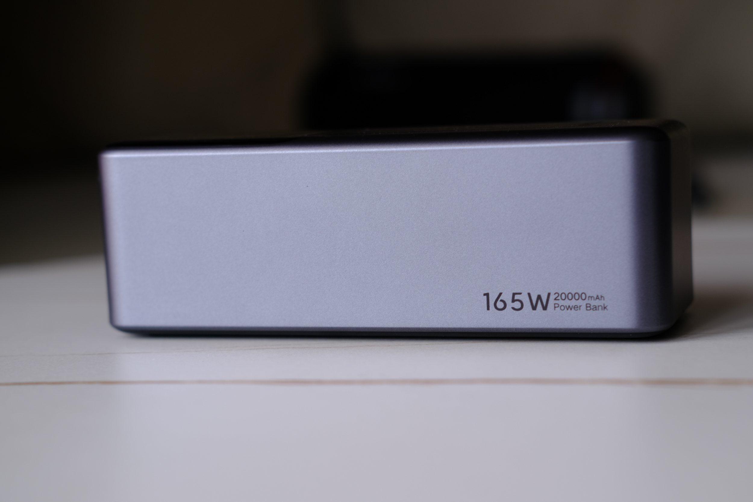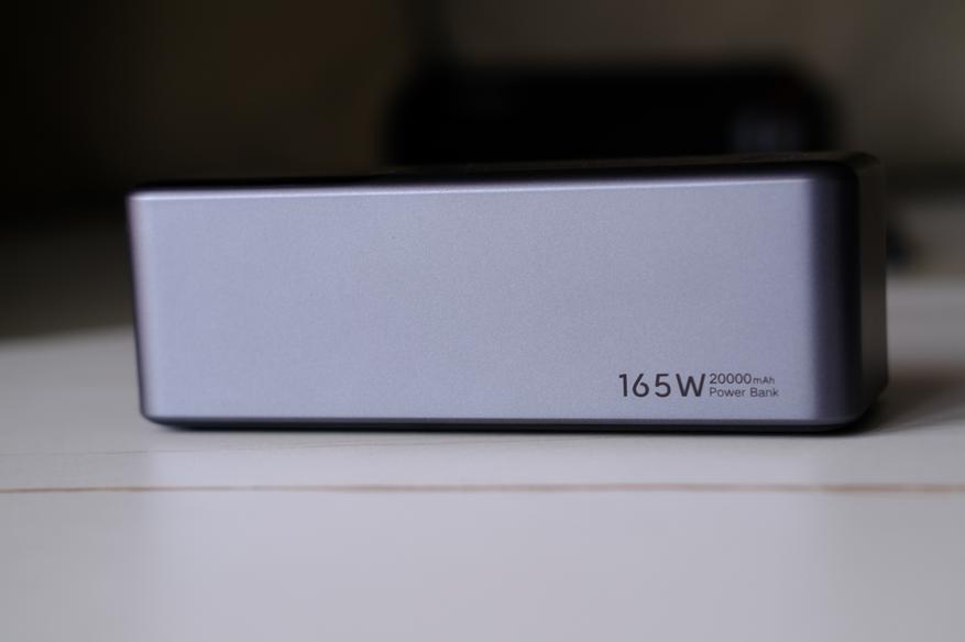А вот на другом (левом) боку, ничего нет. Как и снизу. Хотя сбоку есть текст, о том что мощность банки 165Вт, а ёмкость 20 000 мАч