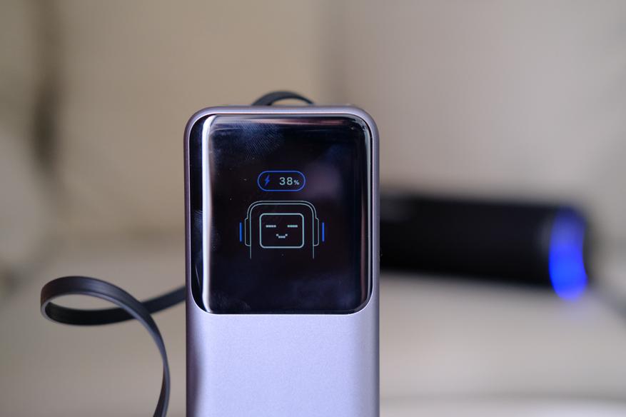 Ну и также достаточно симпатично выглядит отображение процентов зарядки самого повербанка. Если они в пределах нормы, то появляется заставка с довольным лицом. А на основном экране отображается примерное время на которое хватит повербанка при текущем использовании