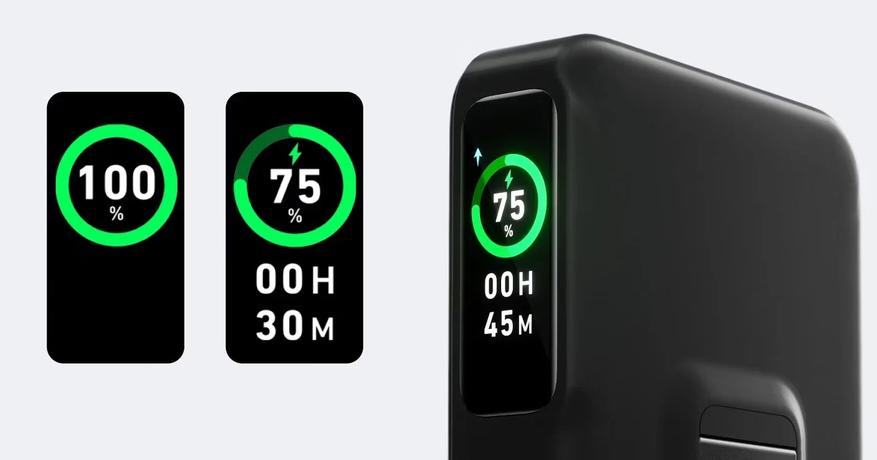 На боковой грани устройства расположен небольшой ЖК-дисплей, выводящий информацию о процессе зарядки в реальном времени: уровень заряда в процентах, статус зарядки и примерное оставшееся время.