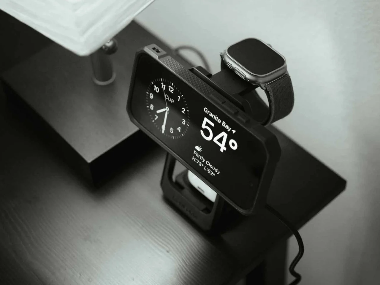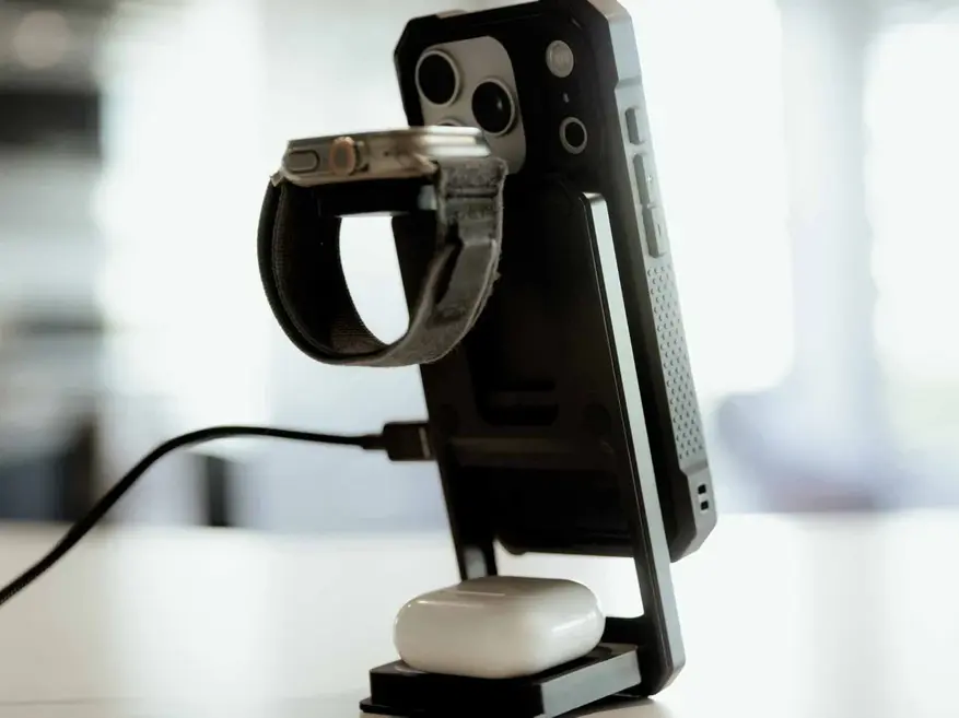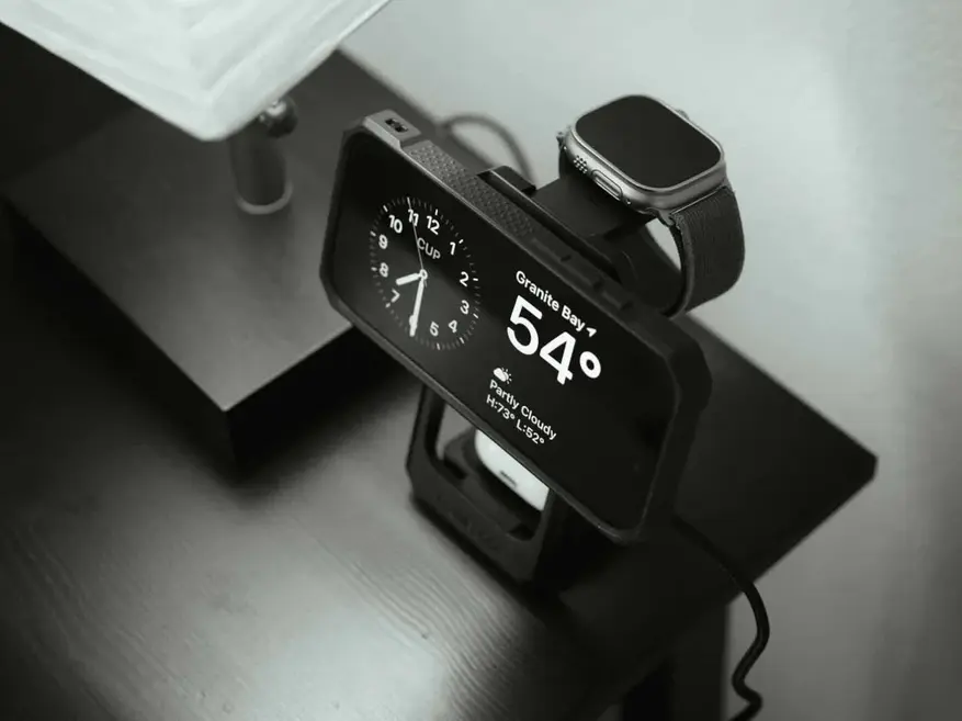 Зарядная станция оснащена тремя площадками разной мощности: подставка для телефона выдает до 15 Вт, площадка для наушников — до 5 Вт. Модуль для Apple Watch выдвижной и убирается внутрь корпуса, когда не используется. Все устройство питается от одного кабеля USB-C.