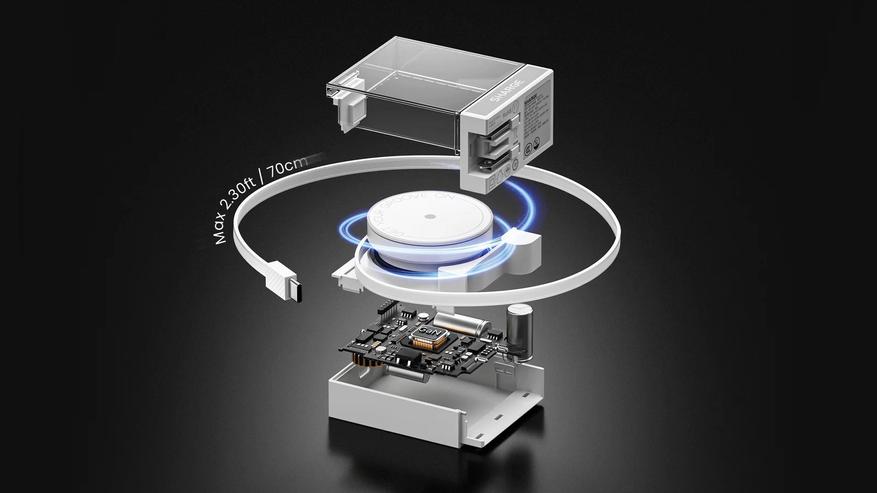 Дополнительно, блок питания оснащён вторым USB-C портом, предоставляя возможность одновременно заряжать два устройства, даже когда встроенный кабель уже используется.