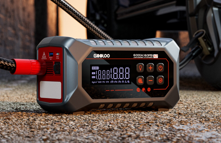 Компания Gooloo, известная своими автомобильными гаджетами, вывела на мировой рынок новый многофункциональный гаджет A7, который объединяет сразу несколько полезных функций. Устройство работает как прыжковый стартер мощностью 6000 А, портативный аккумулятор для зарядки электроники и компрессор для шин.