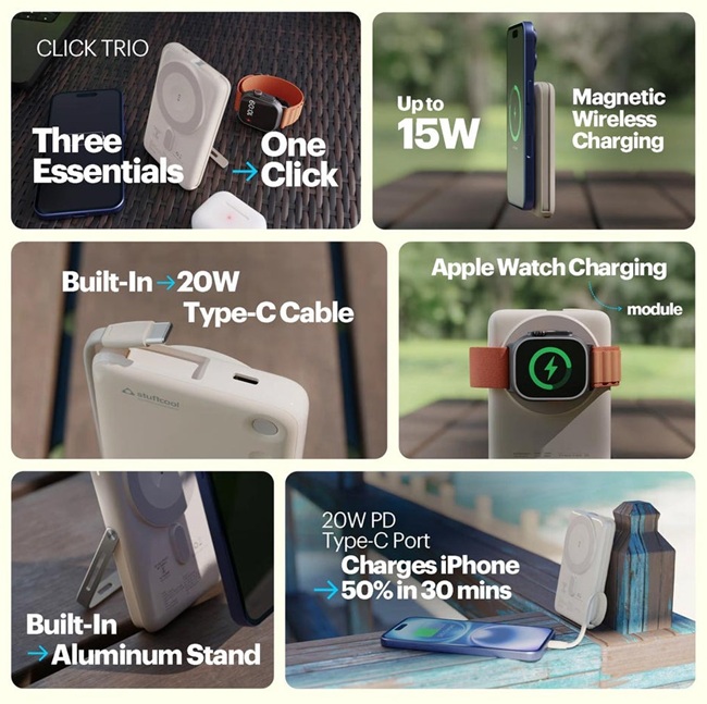Stuffcool выпустила внешний аккумулятор Click Trio с беспроводной зарядкой для устройств Apple