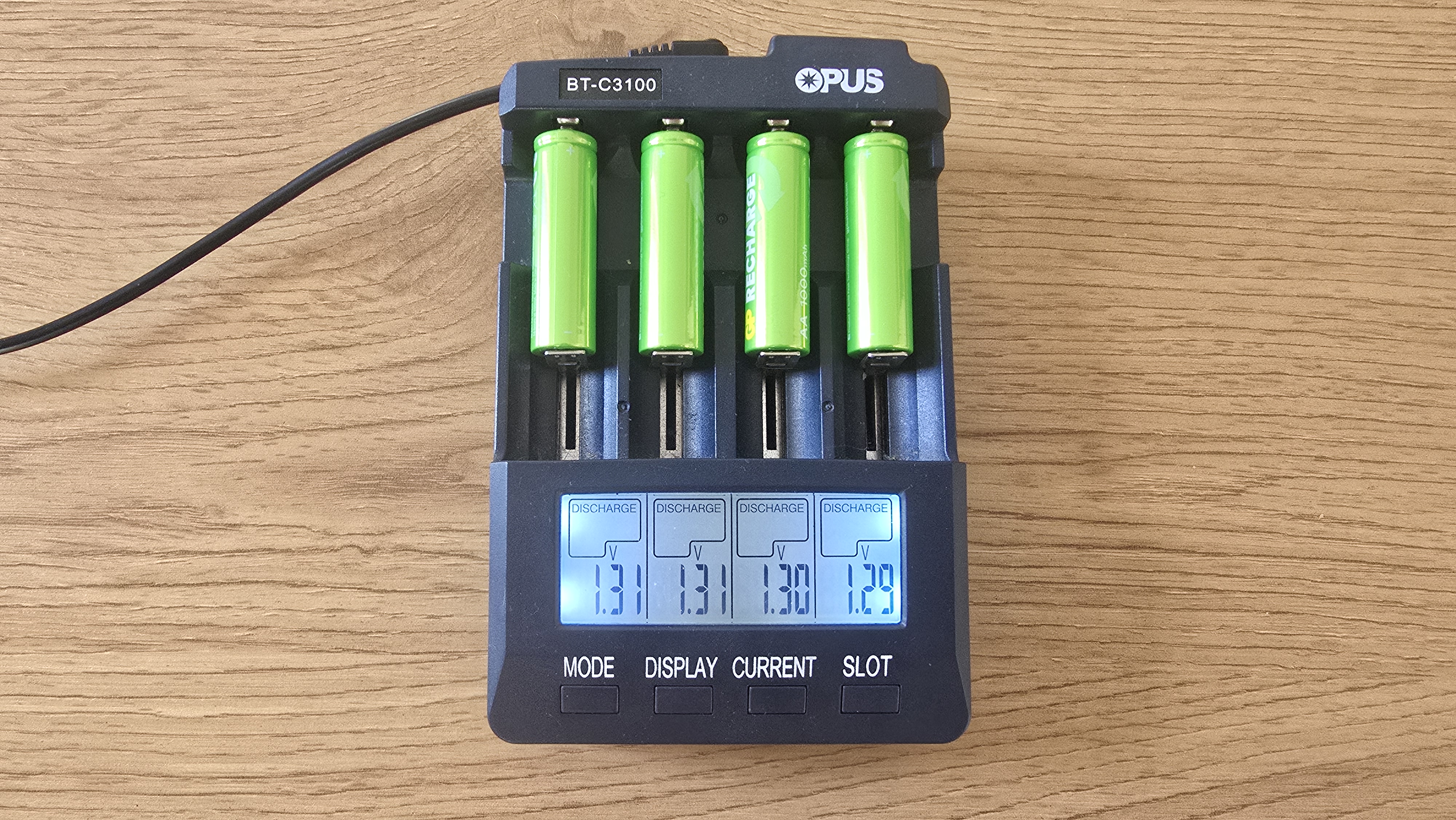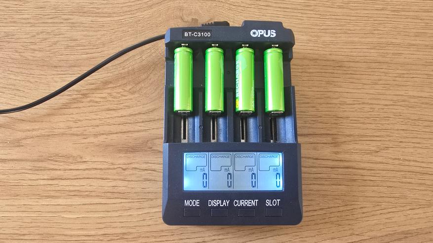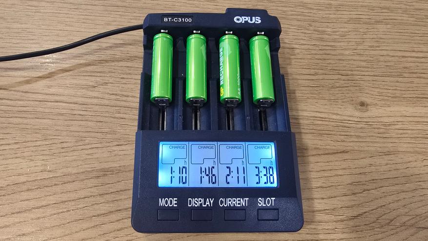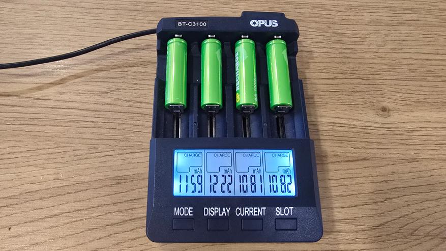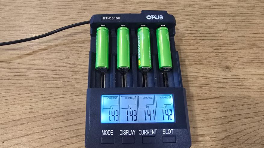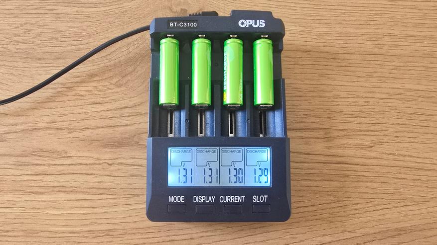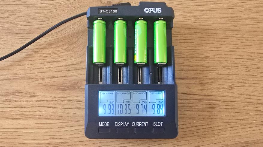Для проверки характеристик аккумуляторов GP 100AAHCV-2CRSBC4 использовалось зарядное устройство Opus BT-C3100, которое позволяет контролировать процесс зарядки и разрядки по каждому элементу. Аккумуляторы были установлены в разные слоты с токами зарядки 1000, 700, 500 и 300 мА. При зарядке напряжение аккумуляторов колебалось в диапазоне 1.41-1.43 В, что вполне нормально для никель-металлогидридных (NiMH) элементов под нагрузкой. Разброс между ячейками оказался минимальным — всего около 0.02 В. После завершения зарядки зафиксированы следующие накопленные емкости: 1159, 1222, 1081, 1082 мАч. Эти значения превышают заявленные производителем 1000 мАч, что можно рассматривать как положительный результат. Однако нужно учитывать, что подобный «избыток» часто наблюдается у новых аккумуляторов. В процессе эксплуатации после нескольких циклов заряд-разряд показатели могут немного снизиться и стабилизироваться ближе к номиналу.