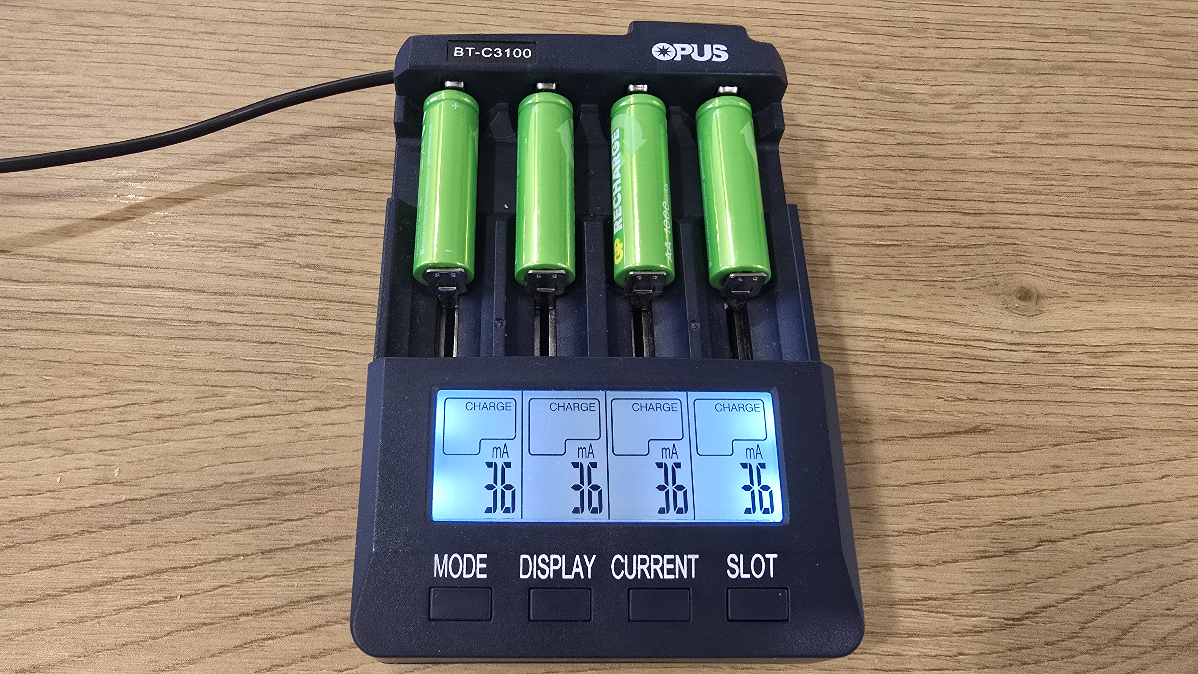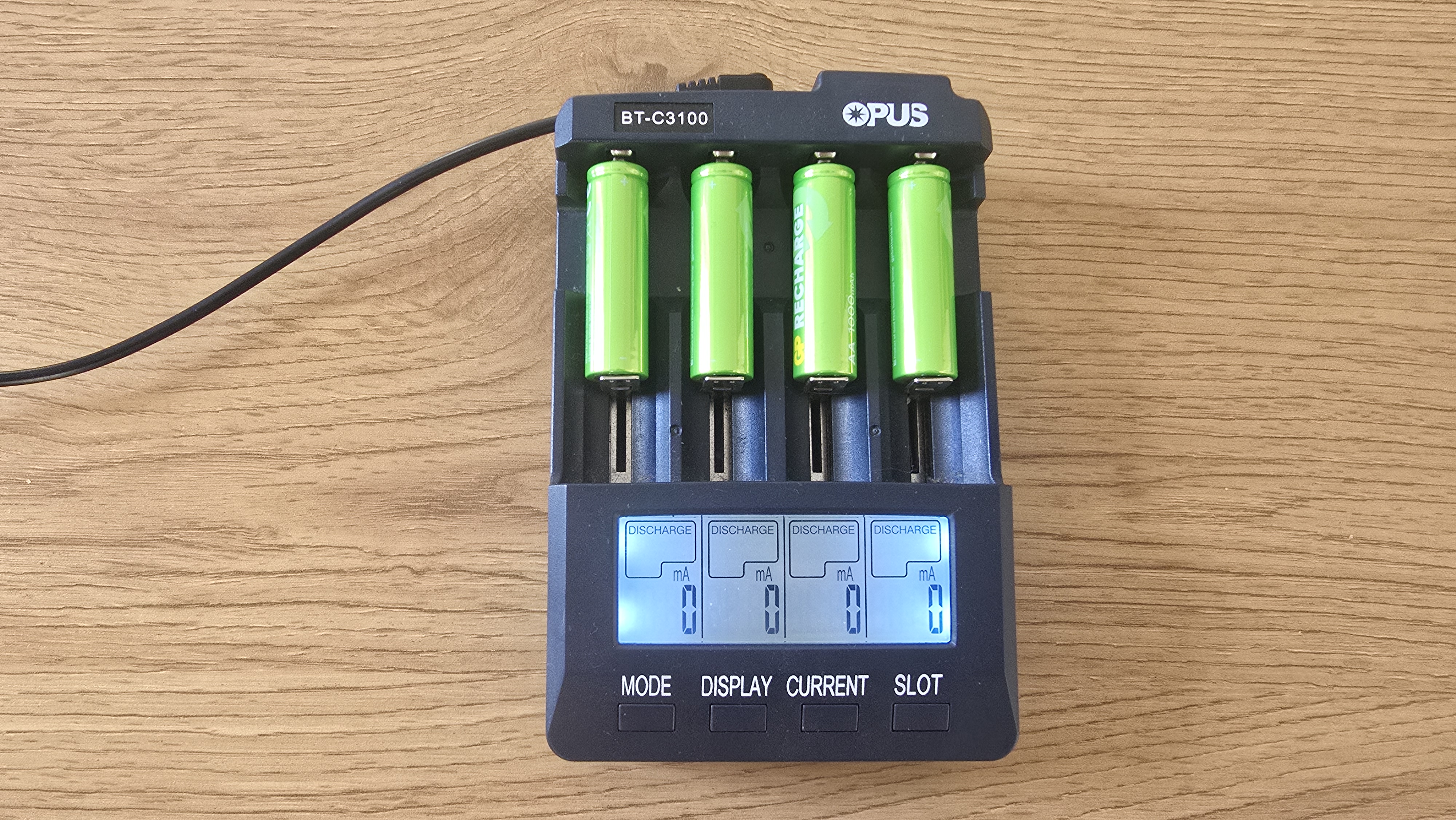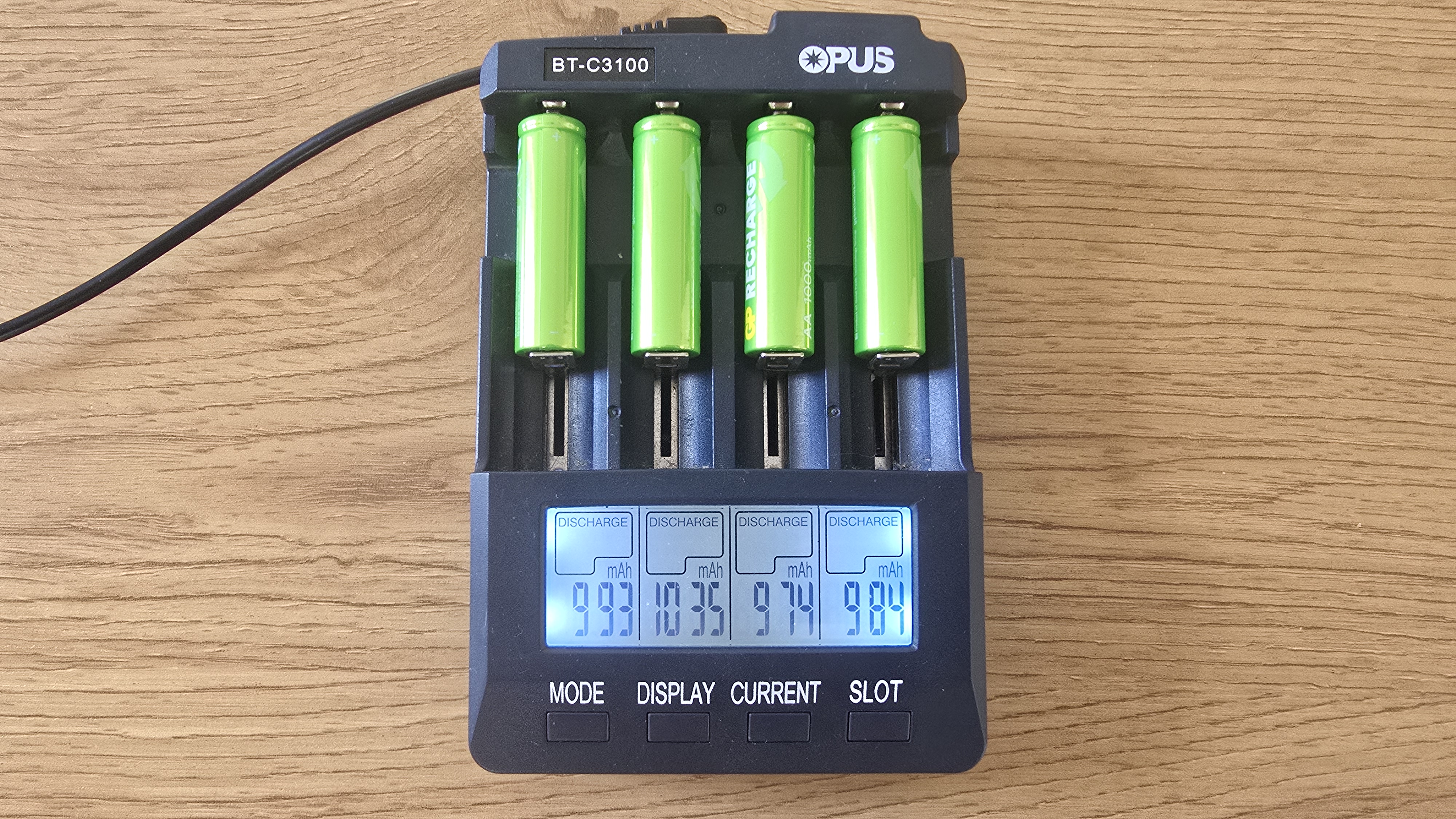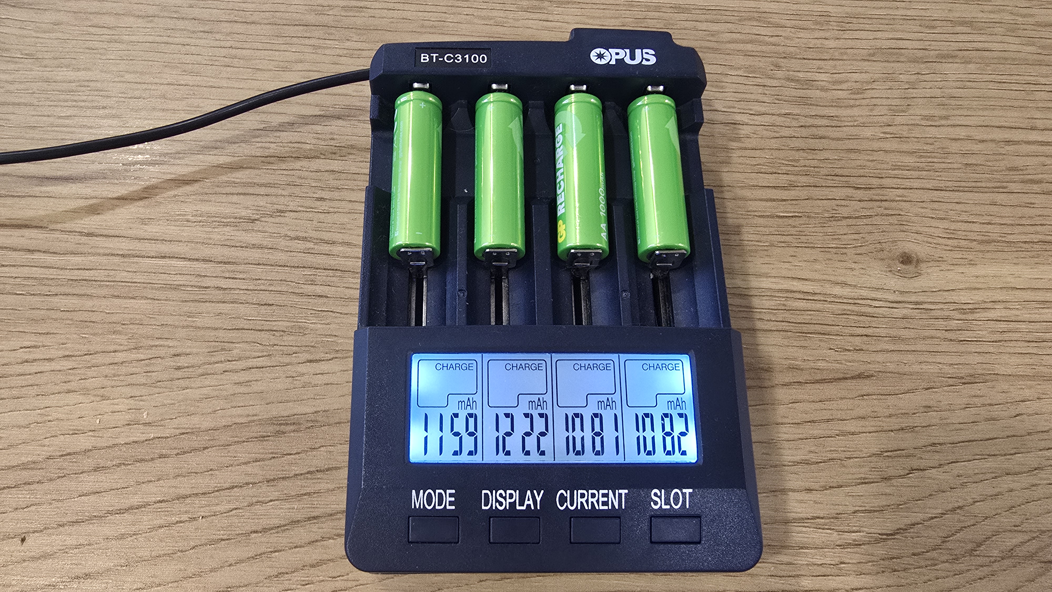 Для проверки характеристик аккумуляторов GP 100AAHCV-2CRSBC4 использовалось зарядное устройство Opus BT-C3100, которое позволяет контролировать процесс зарядки и разрядки по каждому элементу. Аккумуляторы были установлены в разные слоты с токами зарядки 1000, 700, 500 и 300 мА. При зарядке напряжение аккумуляторов колебалось в диапазоне 1.41-1.43 В, что вполне нормально для никель-металлогидридных (NiMH) элементов под нагрузкой. Разброс между ячейками оказался минимальным — всего около 0.02 В. После завершения зарядки зафиксированы следующие накопленные емкости: 1159, 1222, 1081, 1082 мАч. Эти значения превышают заявленные производителем 1000 мАч, что можно рассматривать как положительный результат. Однако нужно учитывать, что подобный «избыток» часто наблюдается у новых аккумуляторов. В процессе эксплуатации после нескольких циклов заряд-разряд показатели могут немного снизиться и стабилизироваться ближе к номиналу.