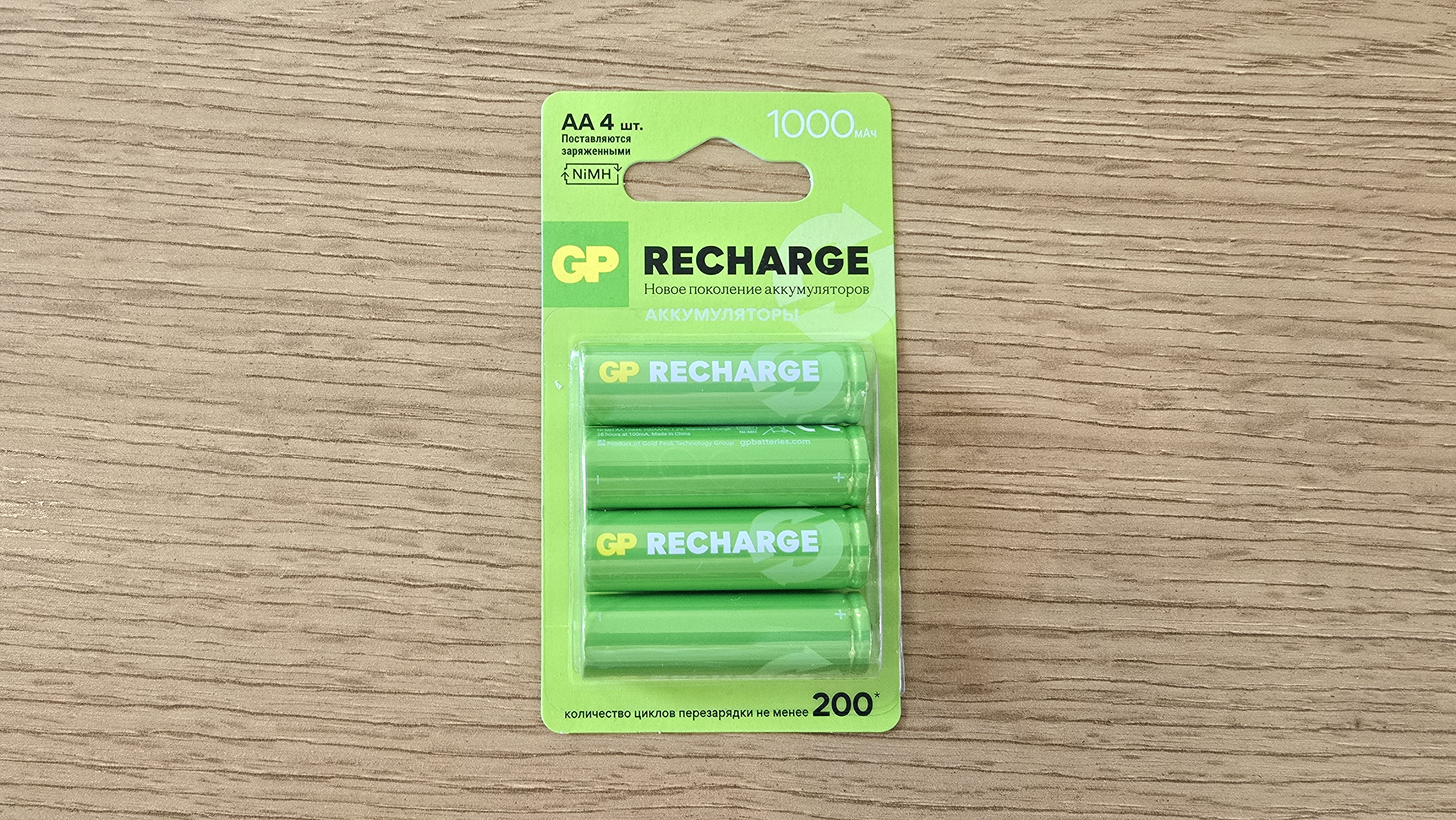 Начну с упаковки. GP 100AAHCV-2CRSBC4 приходят в обычном блистере, типичная розничная подача — прозрачная вставка спереди, через нее видно весь комплект. Цвета — фирменные: зеленый фон, крупные белые надписи. Сразу на лицевой стороне — все, что нужно: формат AA, емкость 1000 мАч, и то, что внутри — NiMH. Отмечено, что элементы заряжены и готовы к работе сразу после покупки. Это мелочь, но удобная — не надо вспоминать, где лежит зарядка.
