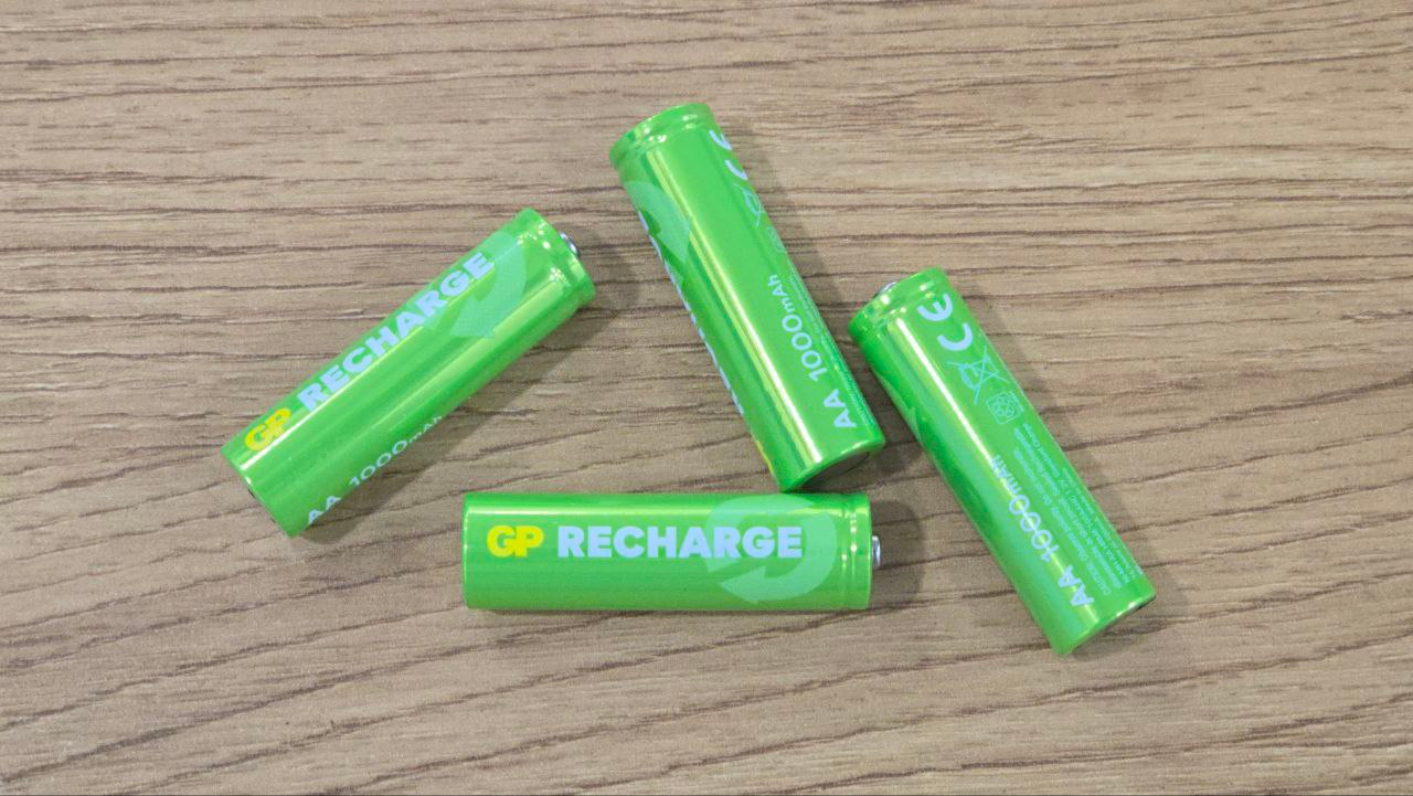 Сами аккумуляторы — стандартного размера, никаких сюрпризов. Зеленый корпус, логотип GP крупный, чуть ниже — надпись Recharge. Выглядят они так, как и должны выглядеть обычные пальчиковые аккумуляторы: цилиндр, примерно 14.5 мм в диаметре, длина около 50 мм. На корпусе есть базовая информация — тип технологии, напряжение и прочее.