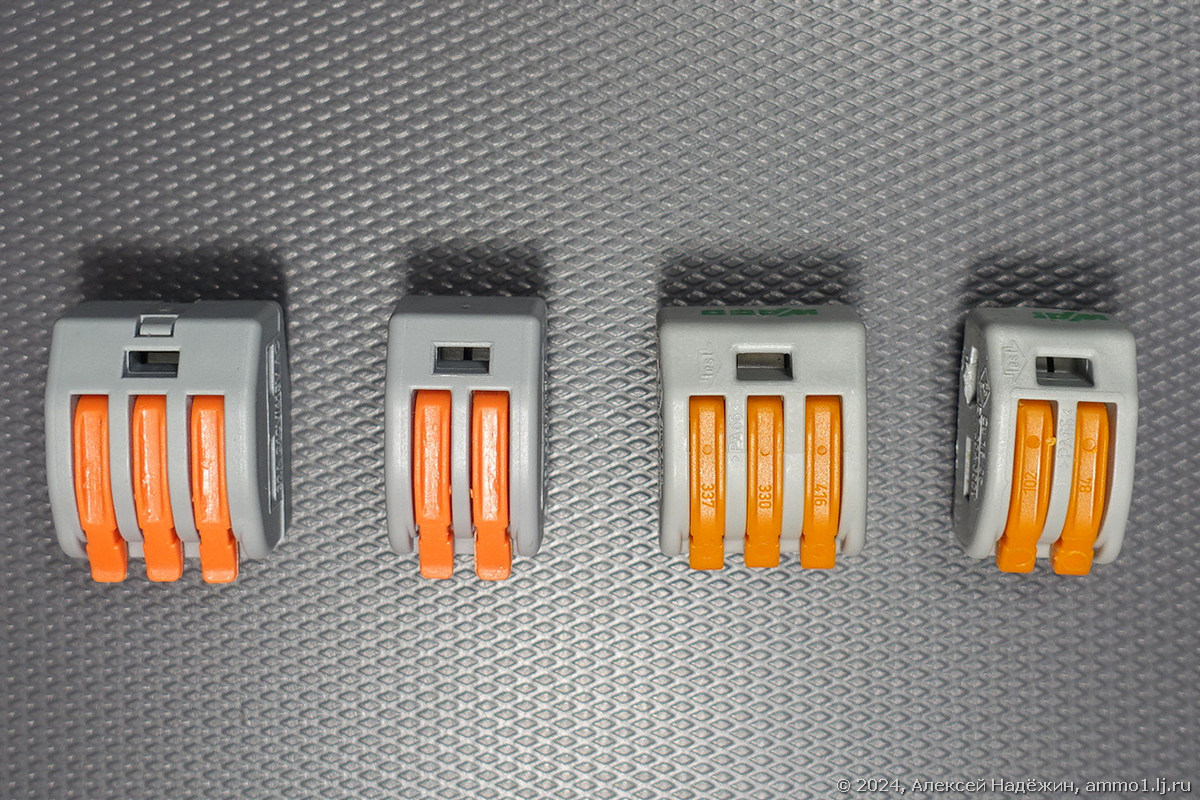 Размер и конструкция клемм абсолютно такая же, как у Wago, только цвет рычажков у duwi чуть краснее (слева duwi, справа Wago).