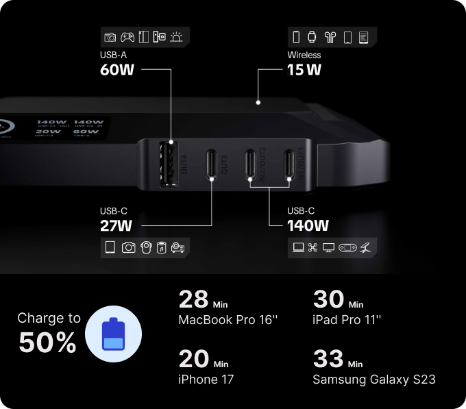 Пользователю доступно 4 порта (3 из них Type-C, два из которых по 140 Вт по протоколу PD), плюс беспроводная зарядка 15 Вт. Собственная зарядка пауэрбанка до 140 Вт (за 1 час).