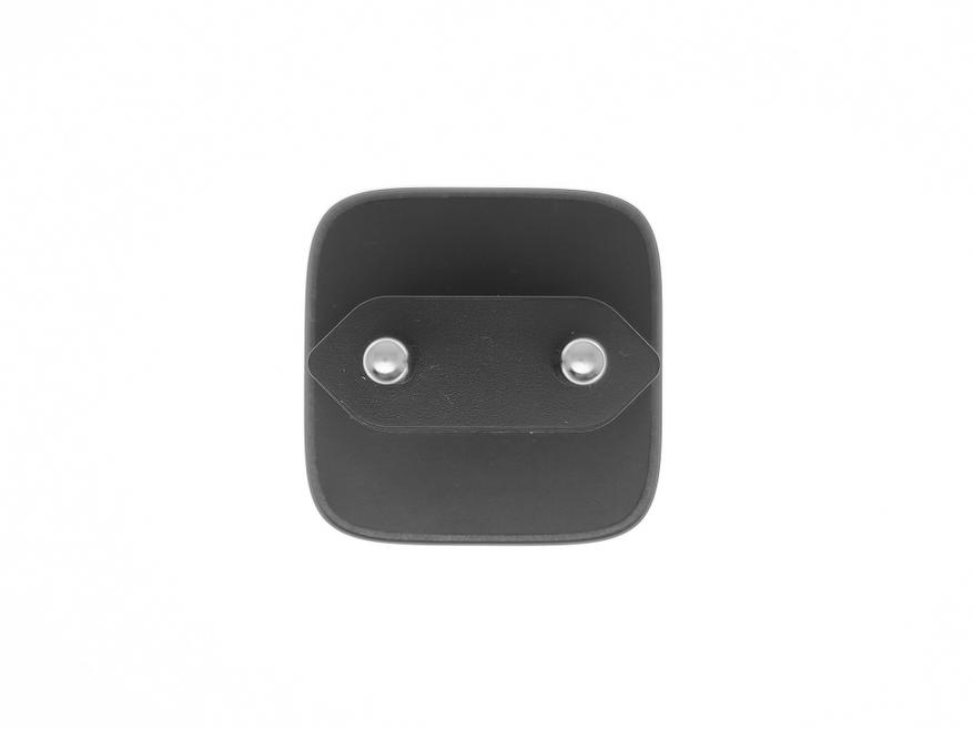 Корпус изготовлен из матового пластика двух цветов: черного и тёмно-серого. Вилка европейская (при заказе можно выбрать данное ЗУ и с американской или английской вилкой). На одной из сторон устройства находится маркировка производителя, а с противоположной стороны напечатаны спецификации. На тыльной стороне ЗУ можно обнаружить два разъема USB-C. Глядя на них сложно не заметить квадратную форму данного устройства. По задумке производителя это должно благоприятно сказаться на эргономике – в соседнюю розетку можно будет вставить ЗУ большого размера.