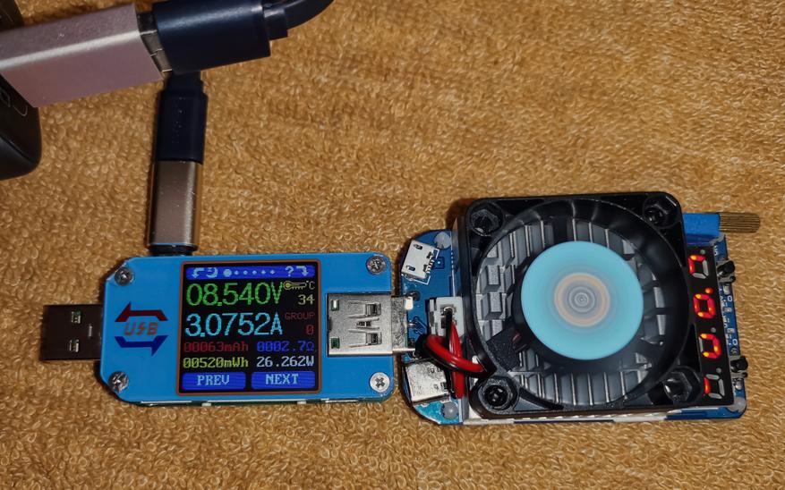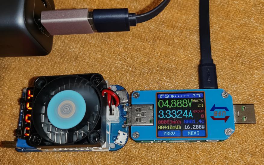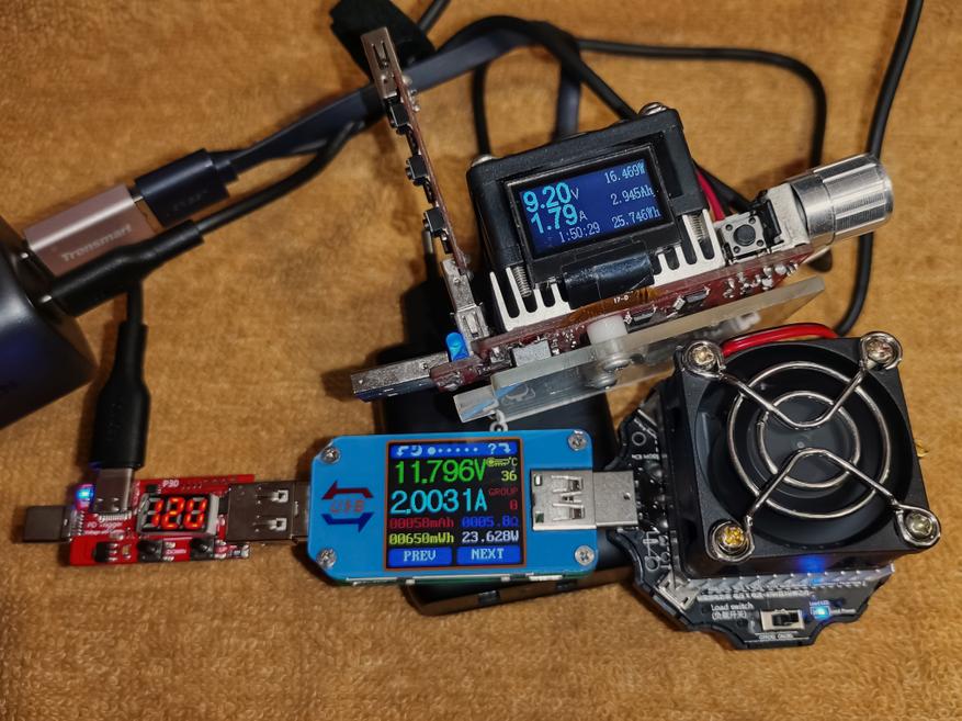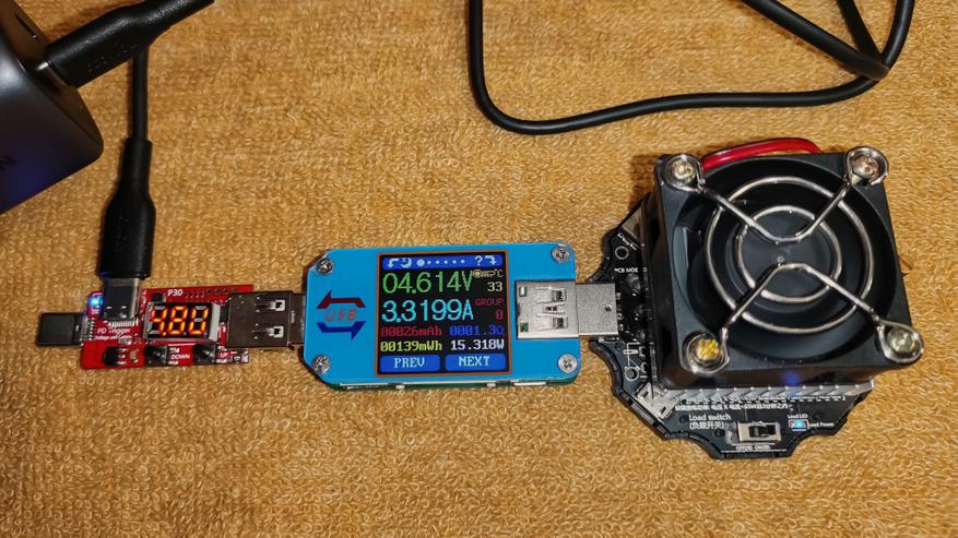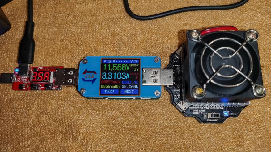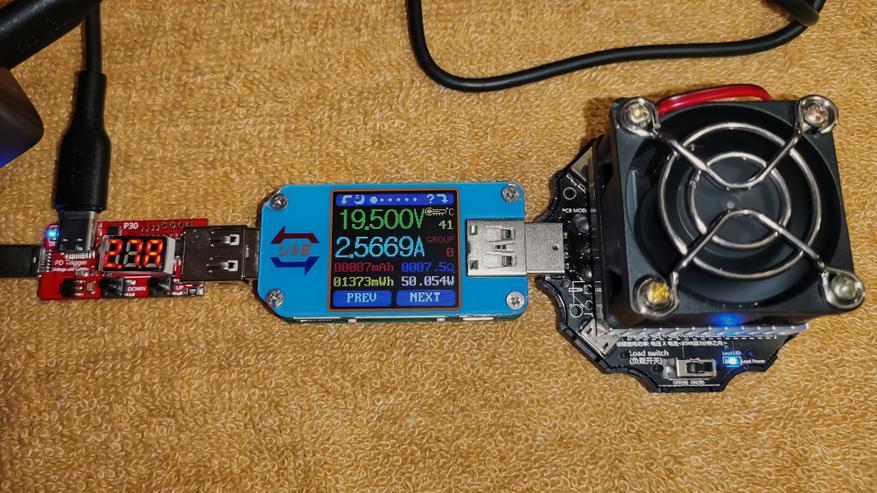 Тест ЗУ с использованием триггера быстрой зарядки Power Delivery. Триггер поочередно переключал между режимами: 5V, 8V, 12V, 15V, 20V, и повышал нагрузку до тех пор, пока не была достигнута максимальная стабильная мощность. Ниже находятся зафиксированные показатели.