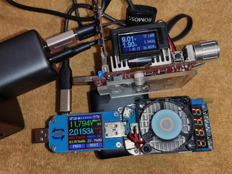 ЗУ Ugreen CD294 позволяет быстрой зарядкой заряжать оба подключенных устройства. Если устройства заряжаются по протоколу Quick Charge 3.0, то суммарная мощность составляет 40.8W. Если же одно устройство заряжается по протоколу Power Delivery, а второе Quick Charge, то суммарная мощность составляет практически те же самые 40W. При зарядке обеих устройств по протоколу Power Delivery, вроде как должно быть 45W. Проверить это на данное время не могу, так как заказанных мультипротокольный триггер на момент создания обзора ещё не пришел.