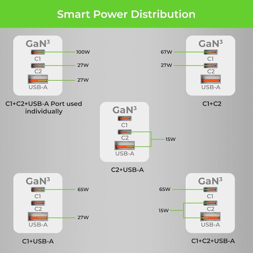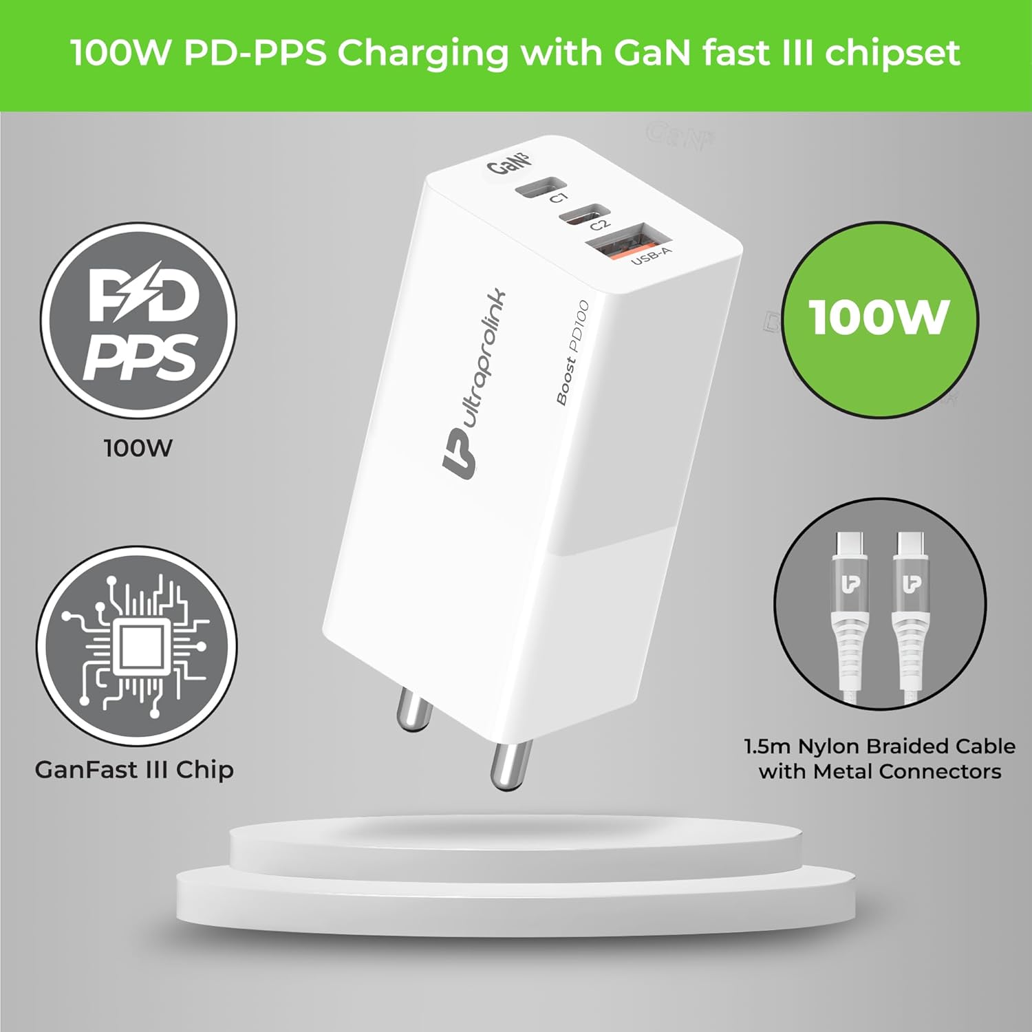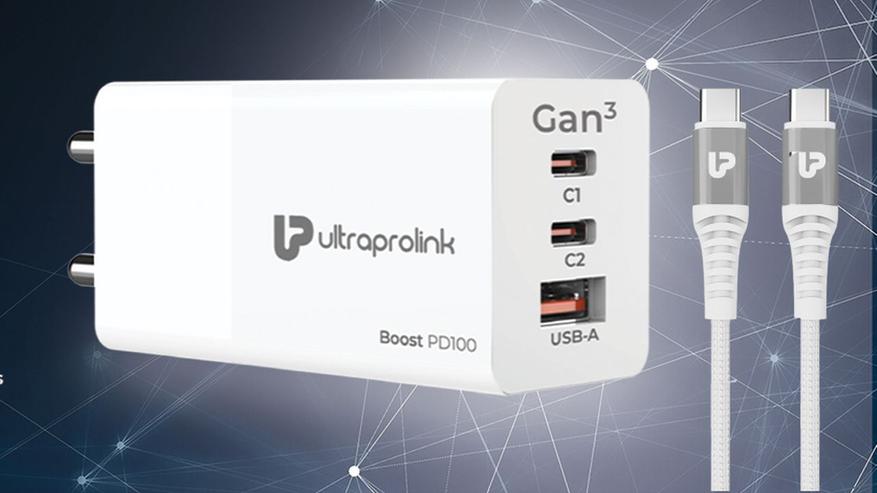 Компания UltraProlink, производитель зарядных устройств и аксессуаров, представила на рынке свой новый продукт — GaN-зарядник Boost PD100 мощностью 100 Вт с поддержкой стандартов Power Delivery (PD) и PPS. Как заявлено, новинка имеет два порта USB-C и одним USB-A, что позволяет одновременно заряжать три гаджета. Основной порт USB-C1 выдаёт до 100 Вт, что подходит для ноутбуков, а USB-C2 и USB-A — до 27 Вт каждый. При одновременном использовании всех портов USB-C1 фиксируется на 65 Вт, а оставшаяся мощность распределяется между остальными.