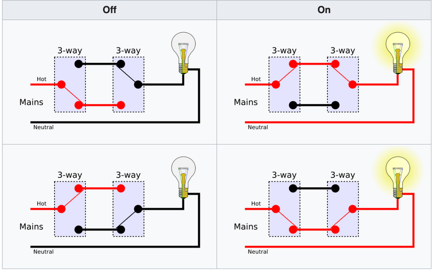 Такие выключатели ставят парой. Один у двери, второй у кровати или в конце коридора. Между ними прокладывается трёхжильный кабель. Щёлкнуть можно в любом месте — свет включится или выключится независимо от того, в каком положении сейчас находится другой выключатель.