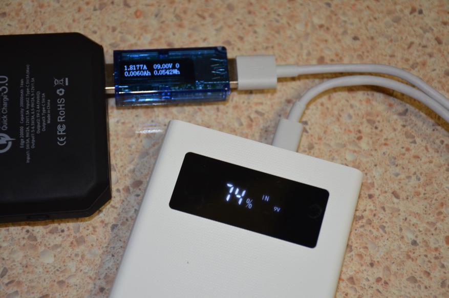 Во-первых, проверил возможность заряжания самого устройства от источника с QC3.0. Поддерживается (на фото режим 12В до 1.5А)