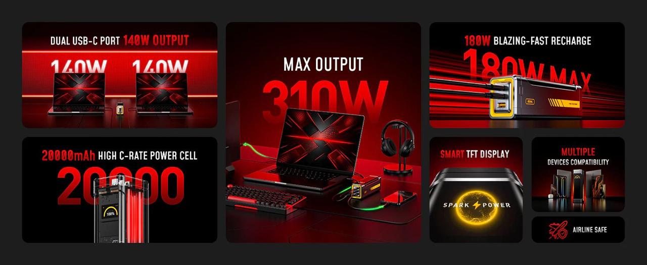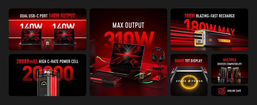 Компания Aohi выпустила на рынок Future Starship Pro — высокопроизводительный внешний аккумулятор емкостью 20 000 мАч, способный заменить сразу несколько мощных сетевых адаптеров. Главной технической особенностью новинки стала суммарная выходная мощность в 310 Вт, что позволяет одновременно заряжать два ноутбука и смартфон без потери скорости на портах.