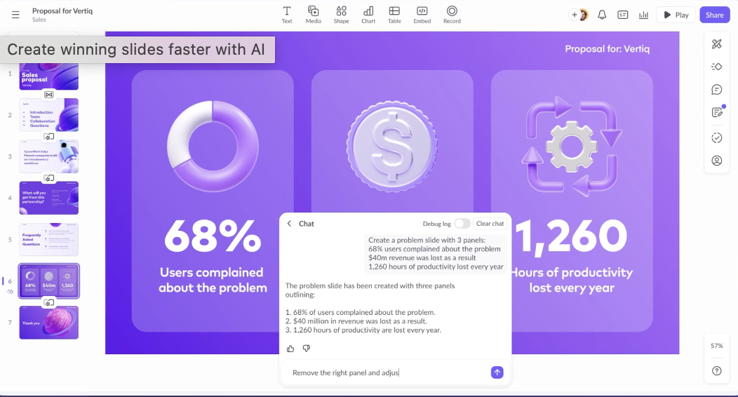 Prezo — это специализированный сервис, где искусственный интеллект отвечает как за текстовое наполнение, так и за визуальную часть слайдов. Платформа будет полезна тем, кто ищет баланс между смысловой нагрузкой и эстетикой, делая акцент на уникальном визуальном оформлении.