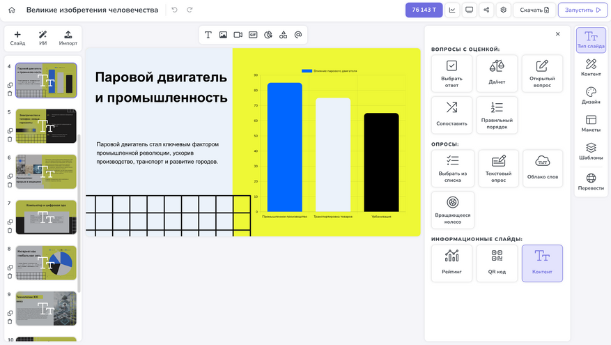 -Встроенный ИИ-помощник собирает слайды, улучшает тексты, генерирует картинки и составляет вопросы для викторин.