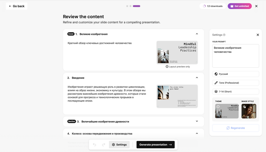 -Возможность редактировать структуру презентации до финальной генерации.