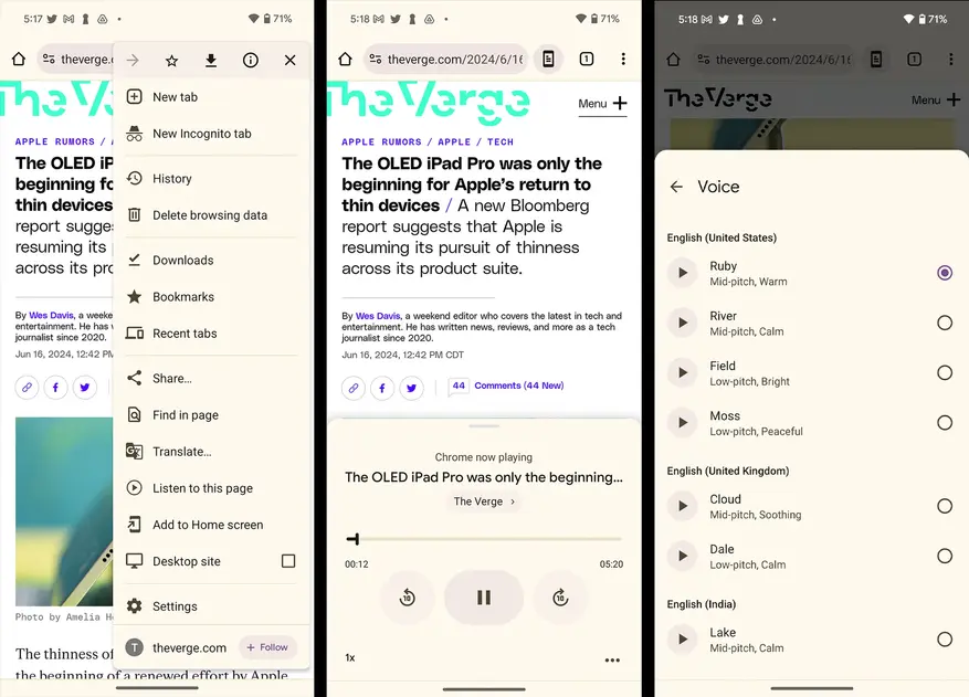 Впрочем, на данном этапе качество синтезированной речи оставляет желать лучшего — звучание достаточно роботизированное, а некоторые слова произносятся некорректно. Также стоит отметить, что Microsoft опередила Google, реализовав более продвинутую функцию преобразования текста в речь в браузере Edge и режиме Immersive View. Кроме того, подобная функциональность уже реализована в браузере Safari для iPhone под названием «Прослушать страницу». Она использует голосовой движок Siri и обладает схожим набором элементов управления.