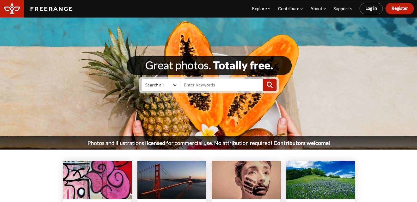 Freerange предлагает уникальную возможность — все фотографии доступны под лицензией Creative Commons Zero, что означает полную свободу использования без каких-либо ограничений. Коллекция не такая обширная, как у лидеров рынка, но качество изображений всегда на высоте. Переходим на главную страницу и используем поисковую строку для быстрого поиска.