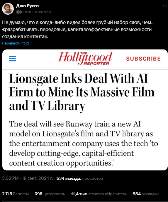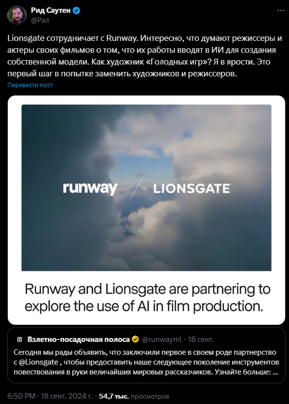 Кинохудожник Рид Саутен написал: «Lionsgate сотрудничает с Runway. Интересно, что думают режиссеры и актеры своих фильмов о том, что их работы вводят в ИИ для создания собственной модели. Как художник «Голодных игр», я в ярости. Это первый шаг в попытке заменить художников и режиссеров».