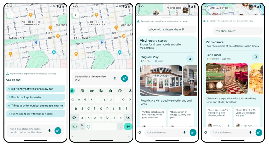 Пока речь идёт об эксперименте, но компания уже поделилась скриншотами интерфейса Ask about. Например, можно сделать запрос «места с винтажной атмосферой в Сан-Франциско» и система выдаст адреса магазинов виниловых пластинок, винтажной одежды, блошиных рынков, а также локации из других категорий мест. Можно будет получить основные сведения о найденных объектах и ознакомиться с краткими описаниями, в которых рассказывается, почему тот или иной адрес будет интересно посетить.