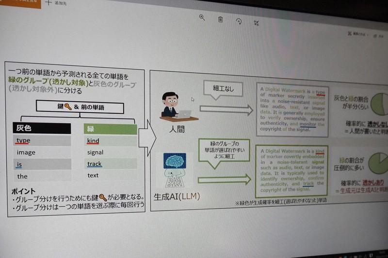 Генеративный искусственный интеллект привел к таким проблемам, как невозможность школ определить, были ли отчеты написаны самими учащимися, даже если последние передали их написание на аутсорсинг новой технологии. Когда люди пишут предложения, на выбор слов влияют различные факторы. Компания Hitachi добавила некоторые слова, которые, как ожидается, будут следовать за каждым словом, в списки слов с цифровыми водяными знаками. Когда искусственный интеллект пишет предложение, он предназначен для автоматического выбора определенных слов из таких списков. Безопасность и другие факторы были повышены благодаря многослойности этих списков.