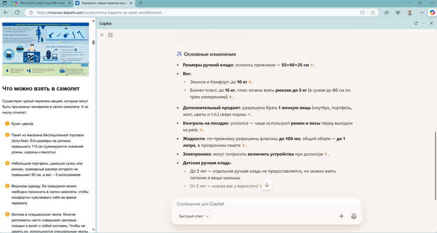 Чтобы понять, насколько он понимает содержание вкладки, я открыл правила ручной клади «Аэрофлота» и спросил про изменения на 2025 год. Copilot не стал уходить в сеть, а прочитал страницу и выдал сухой список новых норм. Всё по делу: размеры, вес, дополнительная личная вещь, ужесточённый контроль на посадке. Ответ пришёл быстро, без пересказов из чужих сайтов.