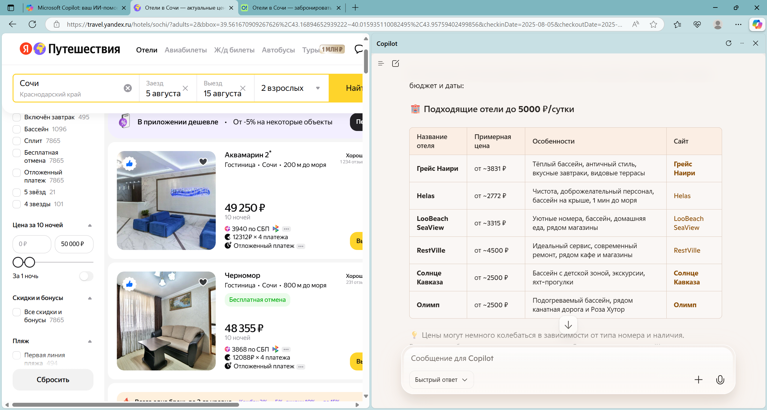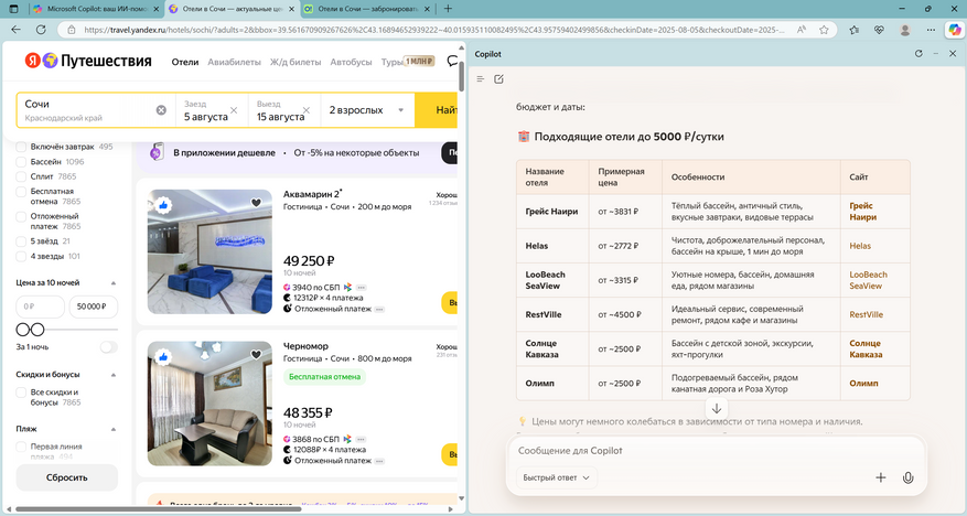 На первый взгляд функция незаметна: скромная панель сбоку, одно окно для запросов, голосовое управление для тех, кому лень печатать. Но главное не в оформлении, а в том, как Copilot работает с контекстом. Он видит открытые страницы и анализирует их на лету. Я проверил это на простом примере: задал ему найти отель в Сочи с бассейном, ценой до пяти тысяч рублей и датами в августе. Через несколько секунд получил подборку с ценами, рейтингами и ключевыми деталями. Ровно то, что нужно, без серии кликов по агрегаторам.
