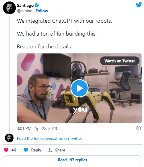 Хотя это дополнение к роботу-собаке выглядит как симпатичная уловка, оно на самом деле имеет несколько полезных реализаций для Spot, как более подробно объясняет Сантьяго. Эти роботы отправляются на ежедневные миссии по сбору большого количества данных, которые трудно превратить сразу в доступную для понимания информацию. Интеграция ChatGPT позволяет команде задавать роботу прямые вопросы по этим предварительно запрограммированным командам, и он может найти на них ответы в режиме реального времени.