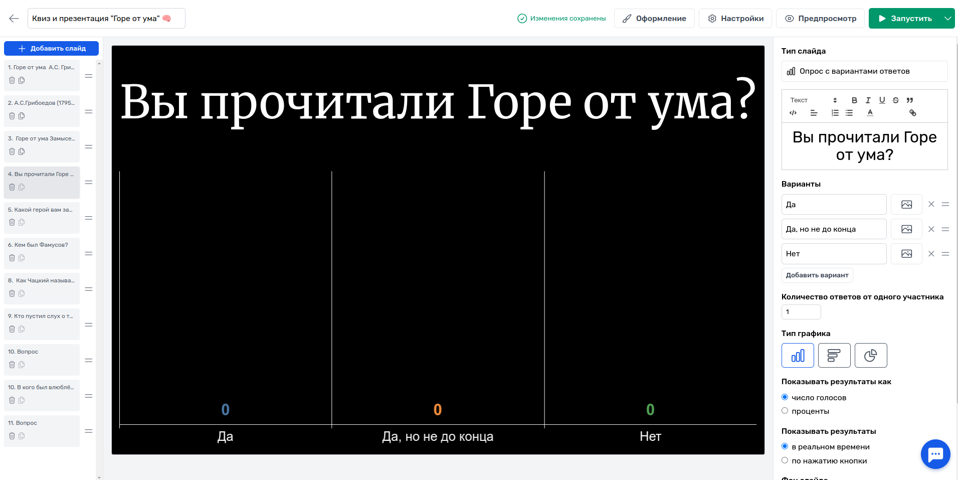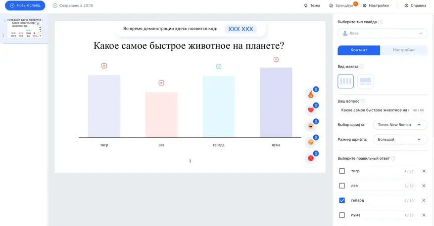 Наличие информационных слайдов помимо вопросов: Есть. Редактор как в PowerPoint