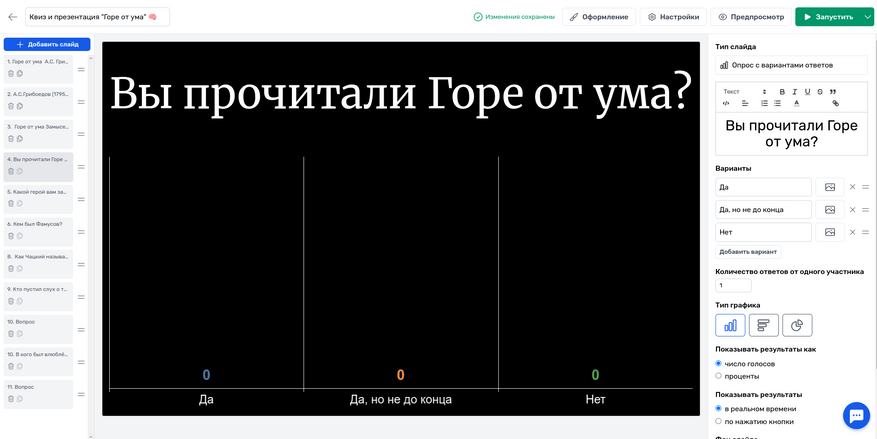 Unislide — это цифровой инструмент для создания интерактивных опросов, викторин и презентаций с поддержкой работы в режиме реального времени. Участники могут подключаться к сессии со смартфонов или компьютеров и отвечать на вопросы различных типов: с выбором одного или нескольких вариантов, с открытым ответом, на установление правильной последовательности, формирование облака слов и другие форматы. Организатор при этом получает оперативную аналитику по результатам и может назначать задания для самостоятельного, асинхронного прохождения.