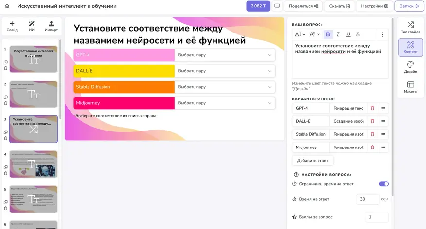 DiaClass позволяет решать задачи, знакомые пользователям Kahoot: создавать презентации, проводить опросы и квизы в реальном времени. Участники подключаются по QR-коду или ссылке прямо со смартфона. Фишка сервиса в ИИ генерации: можно создавать с помощью нейросети как контентные слайды и целые презентации, так и викторины. Это сильно облегчает процесс подготовки материалов. Есть слайды с множественным выбором, сопоставлением пар, указанием правильного порядка, слайды «Да/нет», открытый ответ, колесо фортуны и облако слов. Диакласс является отличной альтернативой Кахут в России.