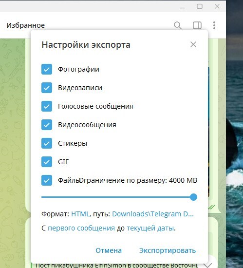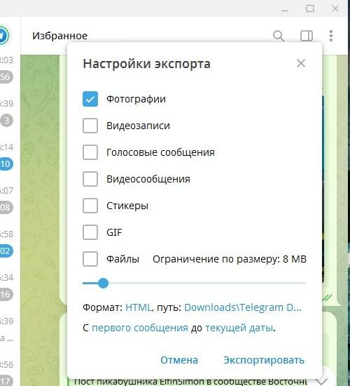 Можно выбрать: медиа из личных чатов, групп или каналов. Файлы сохраняются в виде папок на компьютере, а переписка — в HTML или JSON.