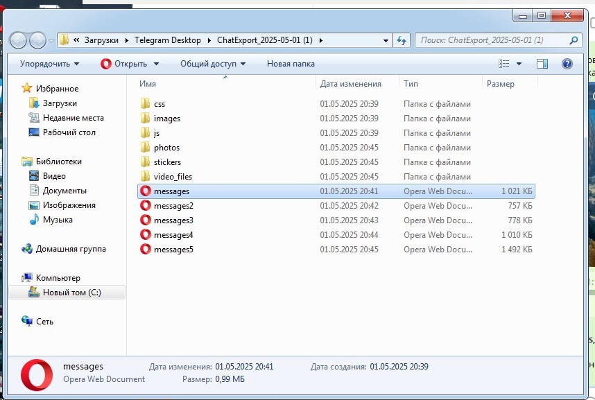 После экспорта данных нажимаем на «Просмотр» и находим все скачанное в одной папке. Переписки, как я и указывала выше, сохраняются как HTML-страница.