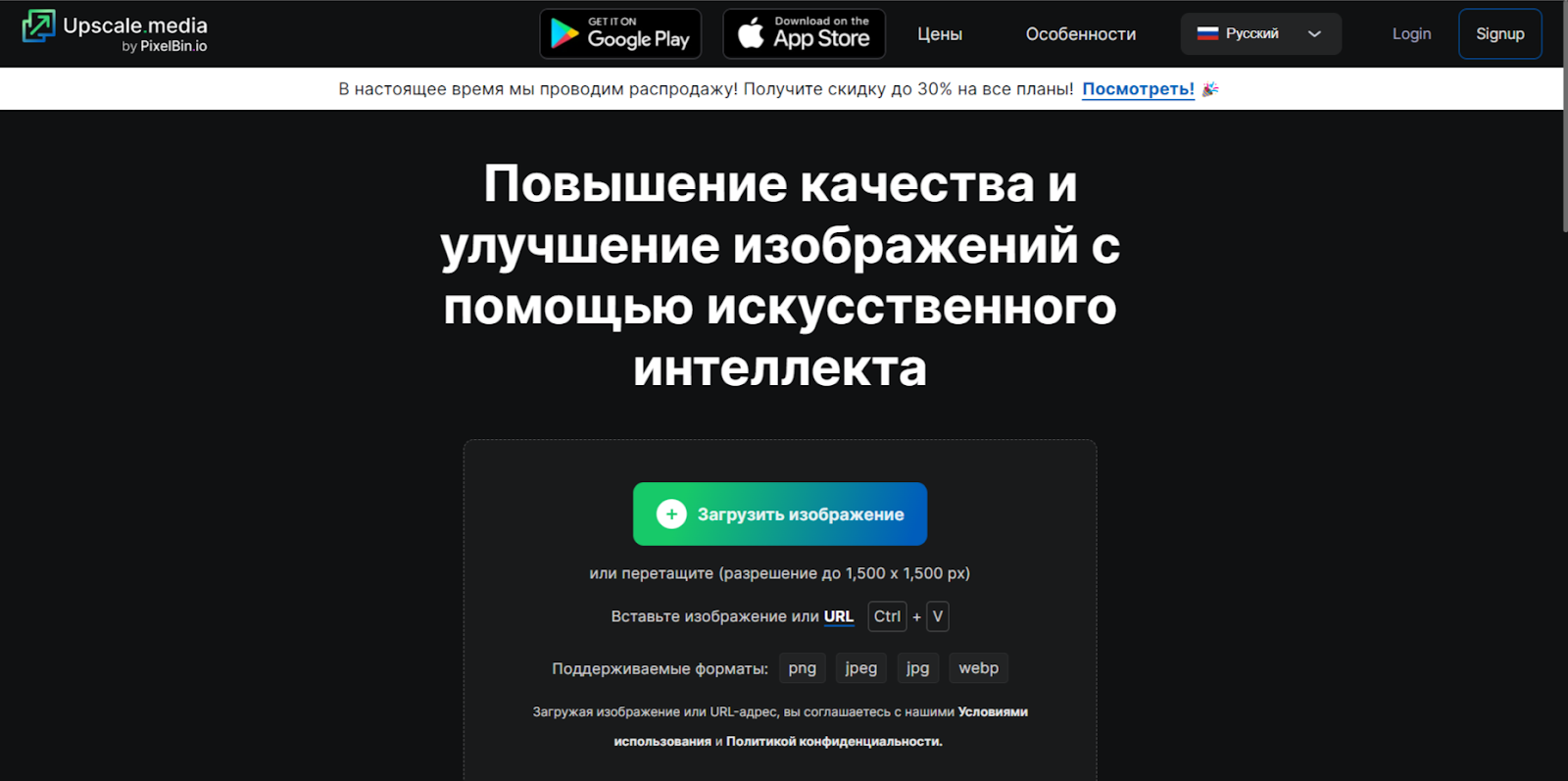Сайт поддерживает изображения в форматах png, jpeg, jpg и webp разрешением до 1,500 x 1,500 px. Об этом можно узнать на этой же странице.