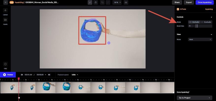Загружаем видео → выбираем инструмент «Object Eraser» → кистью выделяем объект, который нужно заменить → нажимаем «Run». После обработки, скачиваем видео.