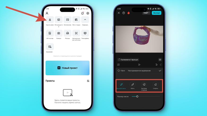 В мобильной версии выбираем инструмент «Удалить фон» → загружаем видео → выбираем «Удаление с параметрами» → кистью выделяем нужный объект.