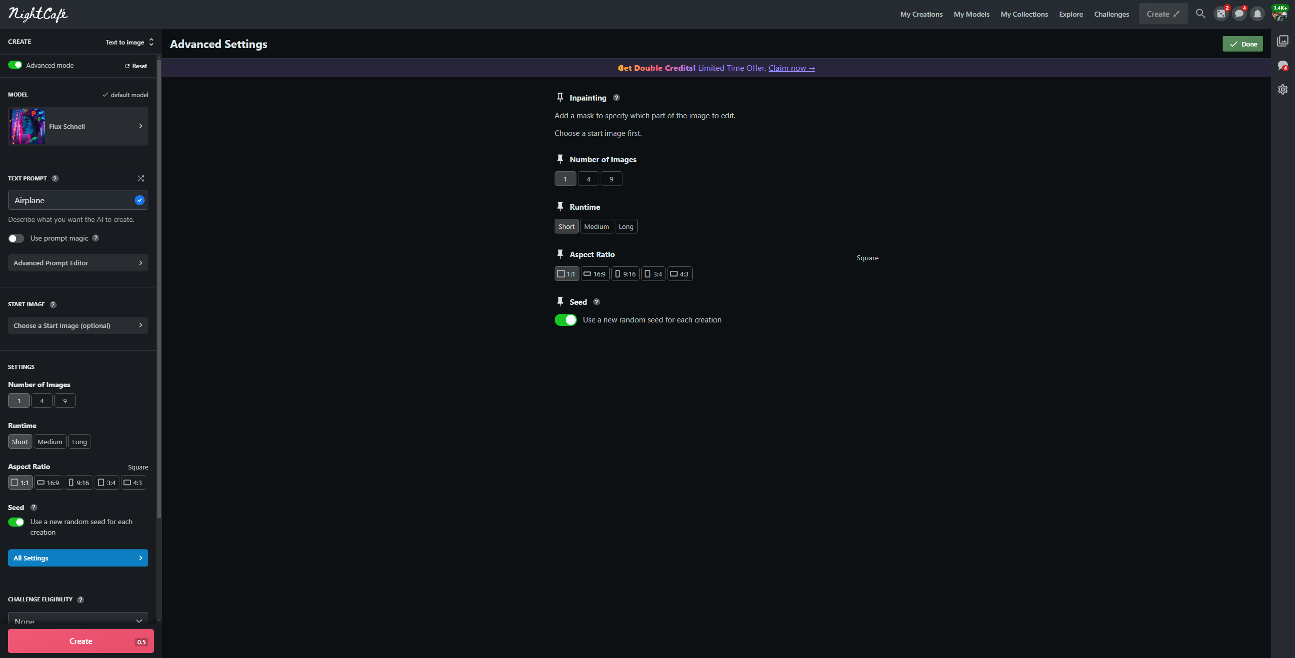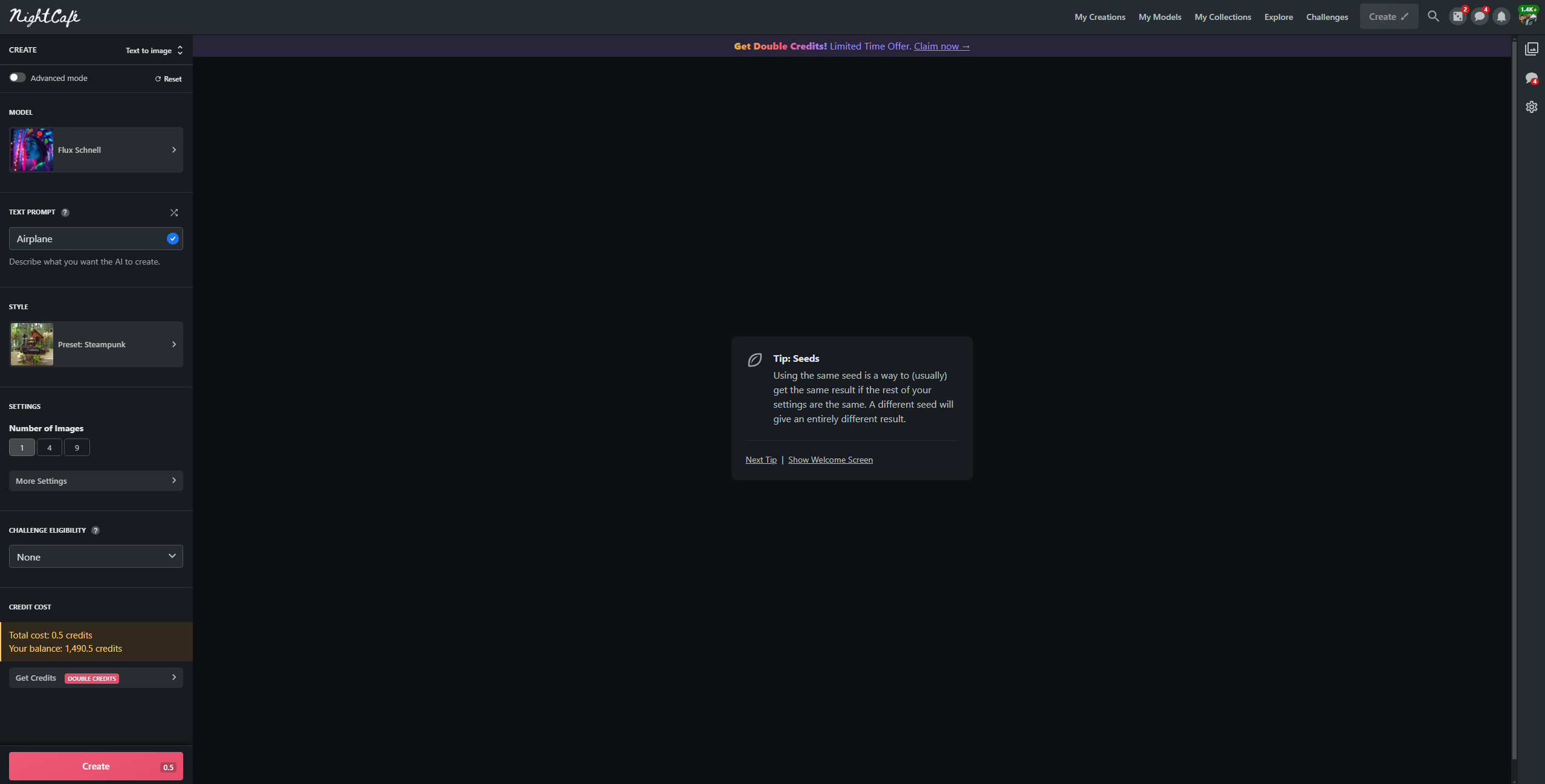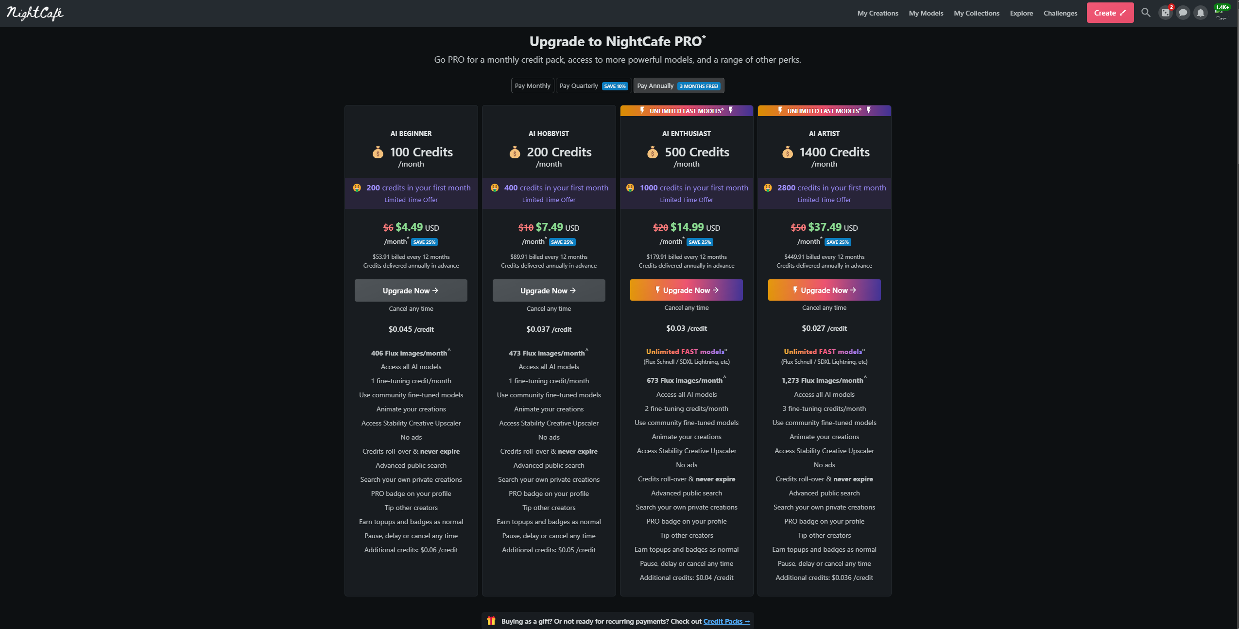 Работа в NightCafe построена на кредитах — внутренней валюте, которая тратится на создание картинок и видео, в зависимости от используемой модели и её настроек количество кредитов за 1 генерацию может варьироваться в пределах от 0.5 до… нескольких десятков. Например, один только апскейл может стоить 25 кредитов.