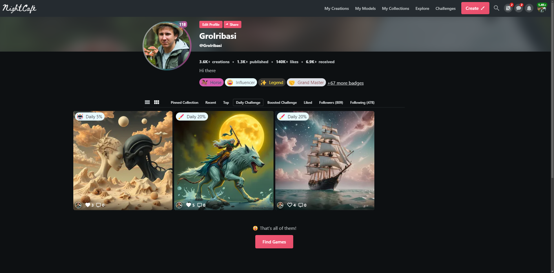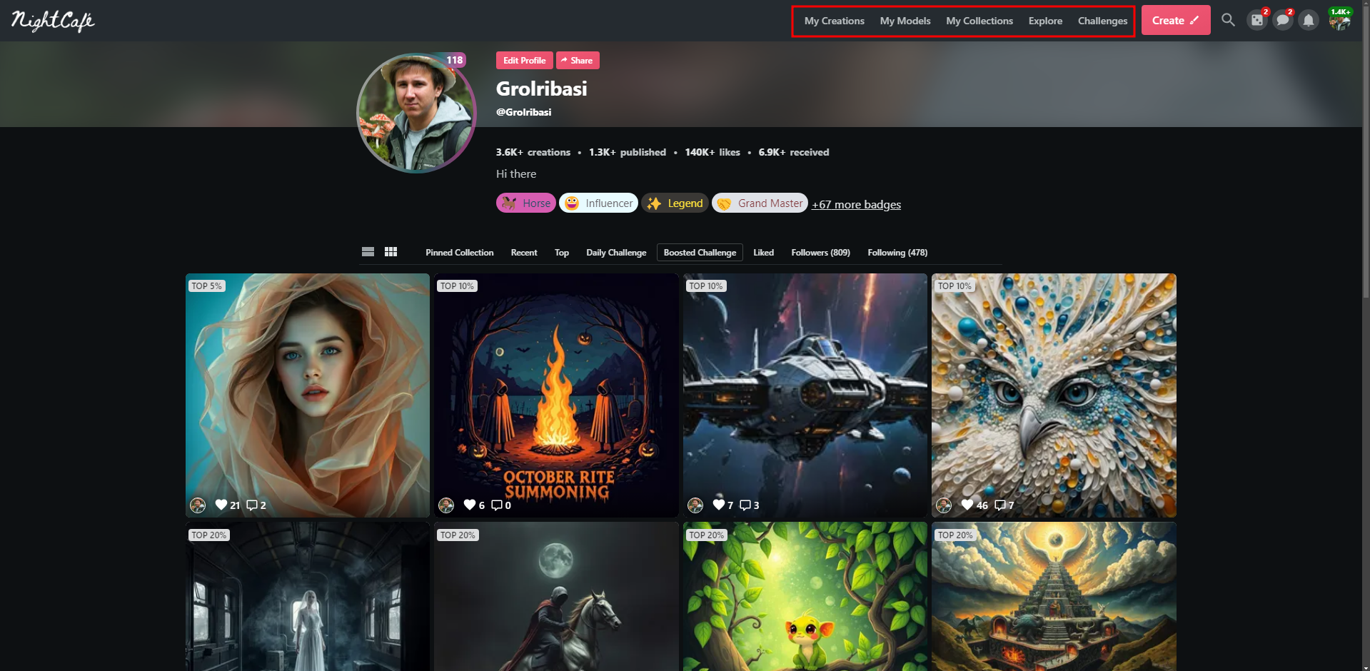 В шапке каждой страницы есть ссылки. Они говорят сами за себя: галерея «моих» картинок, «мои» модели LoRA, коллекции «моих» картинок, челленджи. Отдельно скажу про кнопку «Explore» — она открывает ленту с пользовательскими работами, которую можно отфильтровать, можно просматривать работы, ставить лайки, комментировать. Комментарии исключительно положительные, потому что так принято. Если работа не нравится, проще пройти мимо, чем сообщать об этом автору. И, если честно, это прекрасно. Положительная обратная связь мотивирует создавать больше, а совершенствоваться можно при помощи участия в соревнованиях.