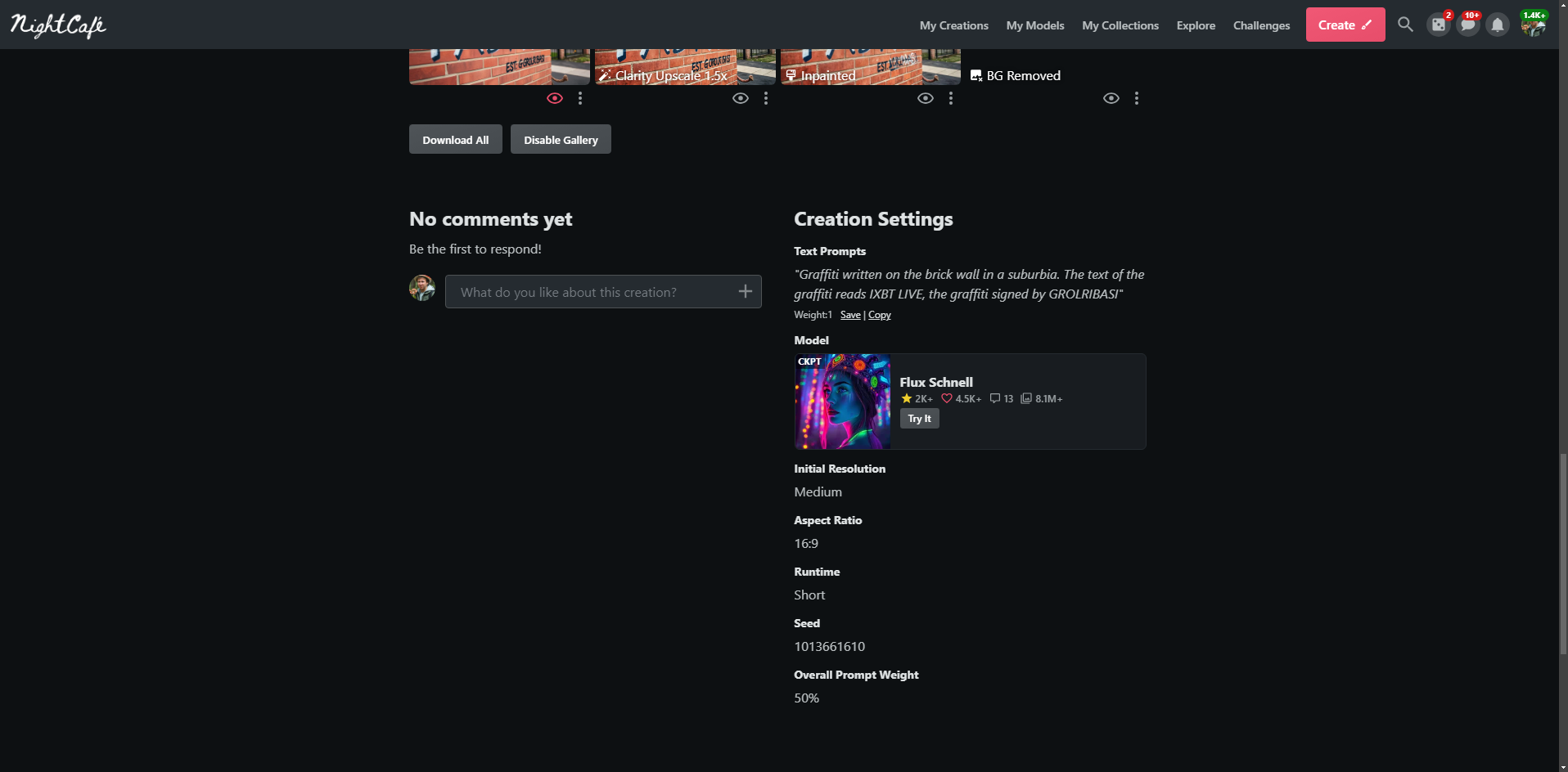 Безусловно, NightCafe предлагает значительно меньшую гибкость настроек по сравнению с HuggingFace или генерациями на собственном железе через специализированное ПО, но зато это бесплатно и почти мгновенно.