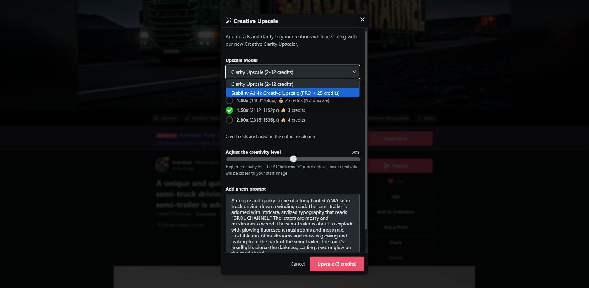 - Creative Upscale — апскейл с добавлением деталей. Это другая модель и если в исходнике есть текст, после такого апскейла он может испортиться. Особенно достанется мелкому тексту. Стоимость в кредитах зависит от желаемого разрешения.