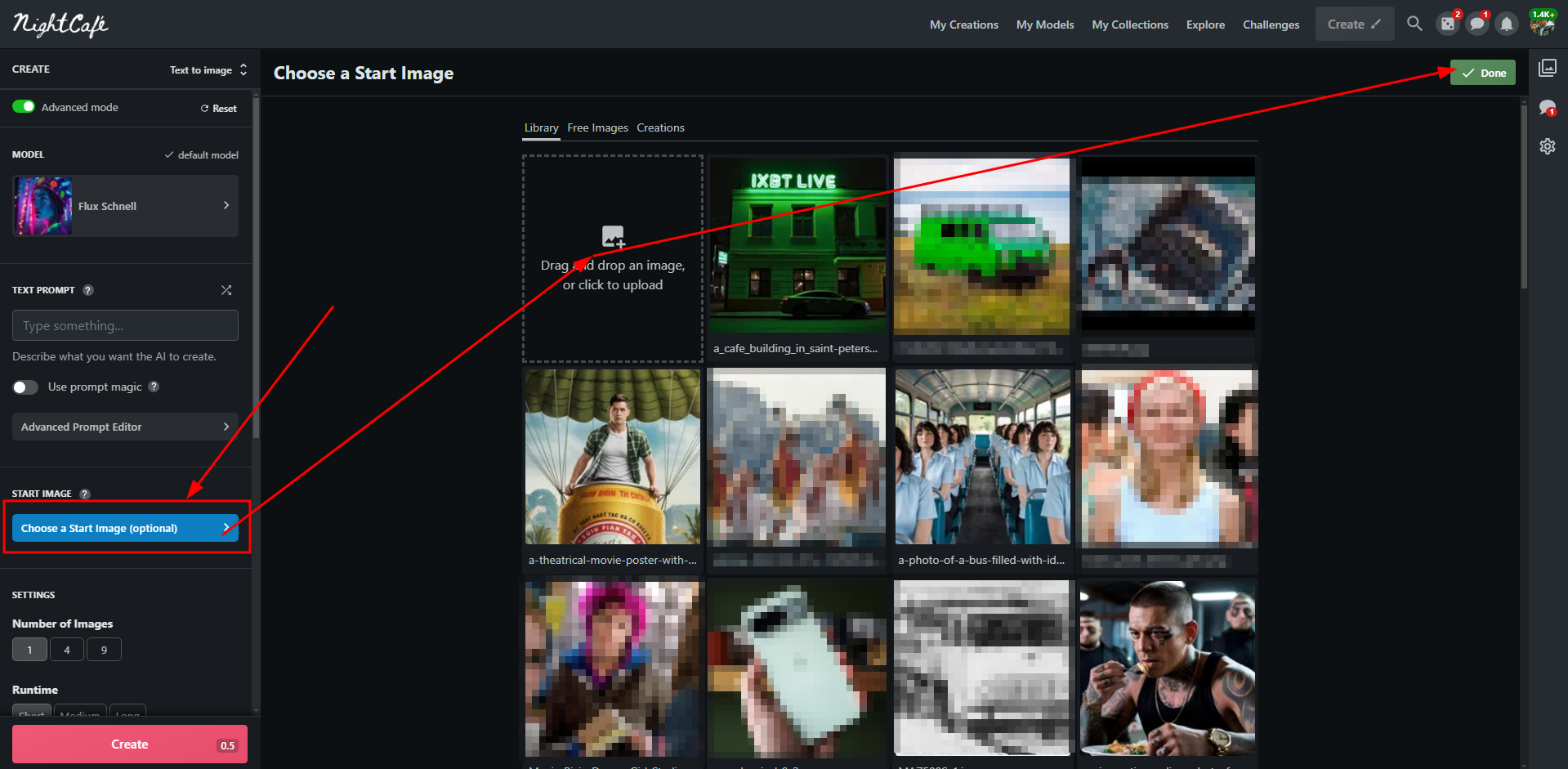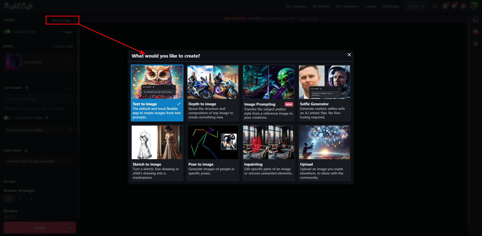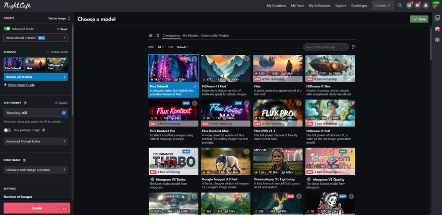 Кстати, обратите внимание на слова «Text to image» напротив переключателя продвинутого режима. Нажатие на текст откроет меню выбора режима создания. Это не очень интересное меню, т.к. оно слегка устаревшее, для каждого режима есть подробное описание, но большая их часть работает на базе более слабых моделей. Проще всего обычно добавить изображение в промпт кнопкой «Choose a start image» в продвинутом режиме. Так вы сможете использовать Flux Schnell для создания картинки по референсу.