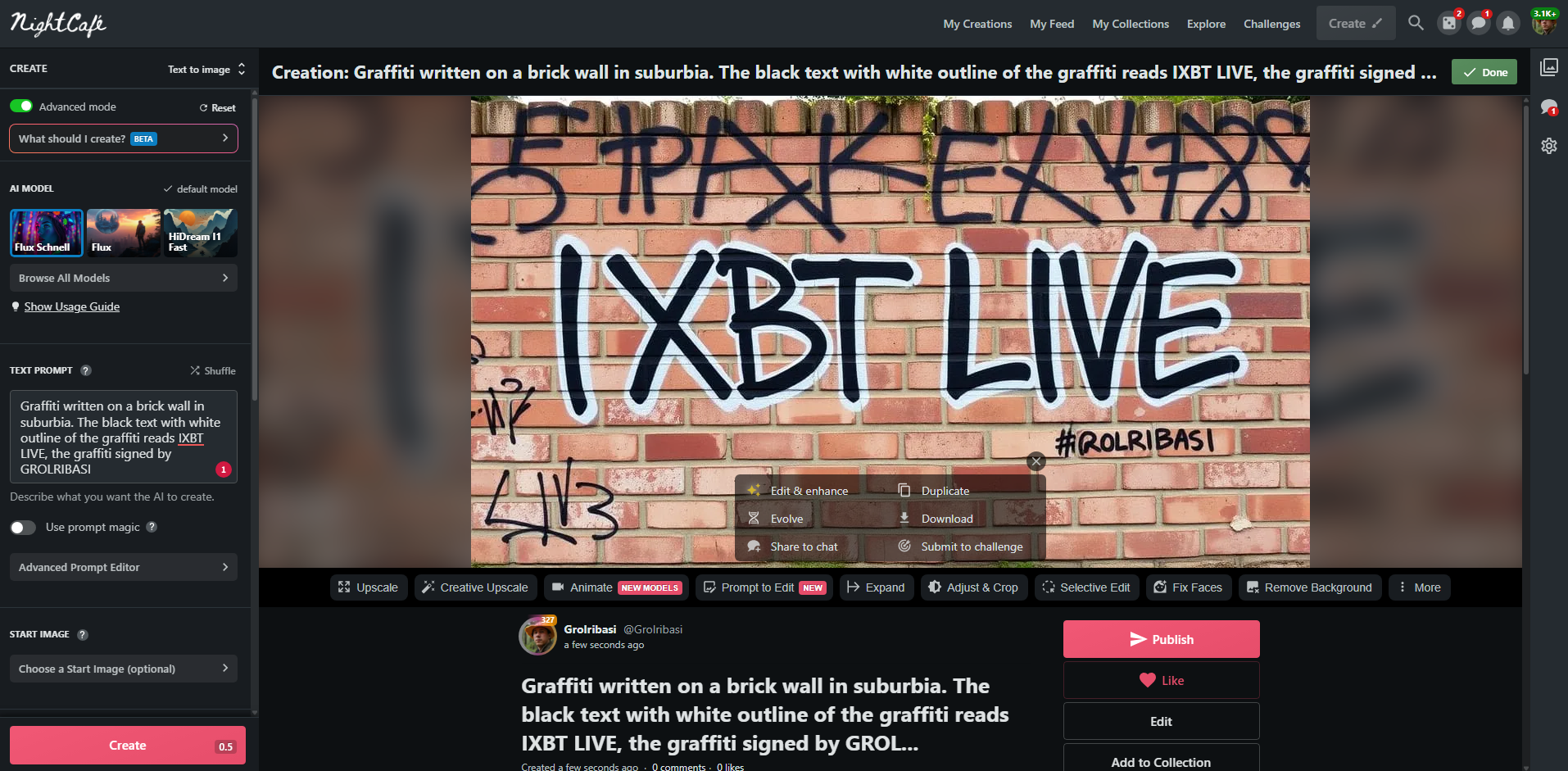 - Prompt to Edit — функция редактирования изображения, позволяет изменить часть картинки, не меняя композицию. Функция работает на базе Flux, поэтому менять с её помощью изображения других моделей — не лучшая идея. Нажимаете на кнопку, откроется меню редактирования картинки, выбираете модель, промптом указываете, что хотите изменить, нажимаете кнопку «Edit», смотрите результат (функция работает без подписки).